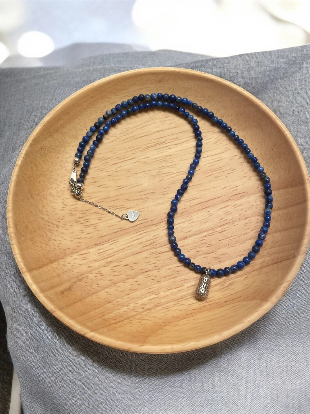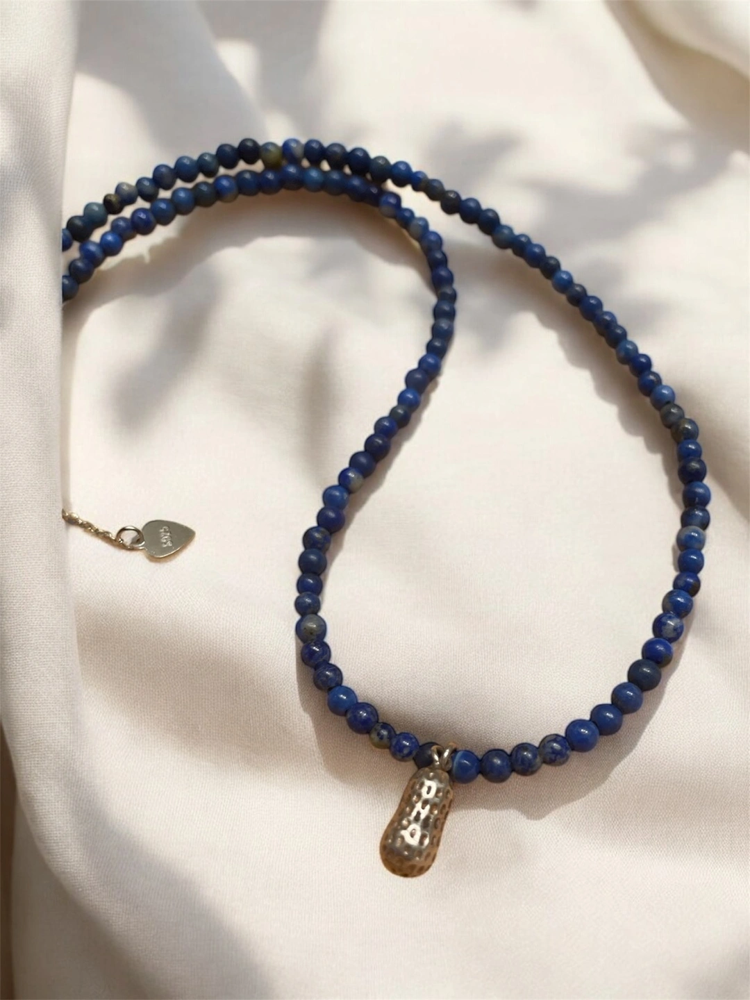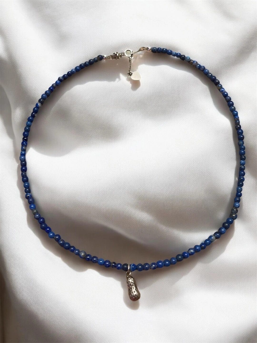 Delicate lapis lazuli beaded necklace. Features a small 925 silver peanut-shaped charm. 925 silver clasp. Adjustable length 37cm to 40cm. Comes with a small velvet pouch.