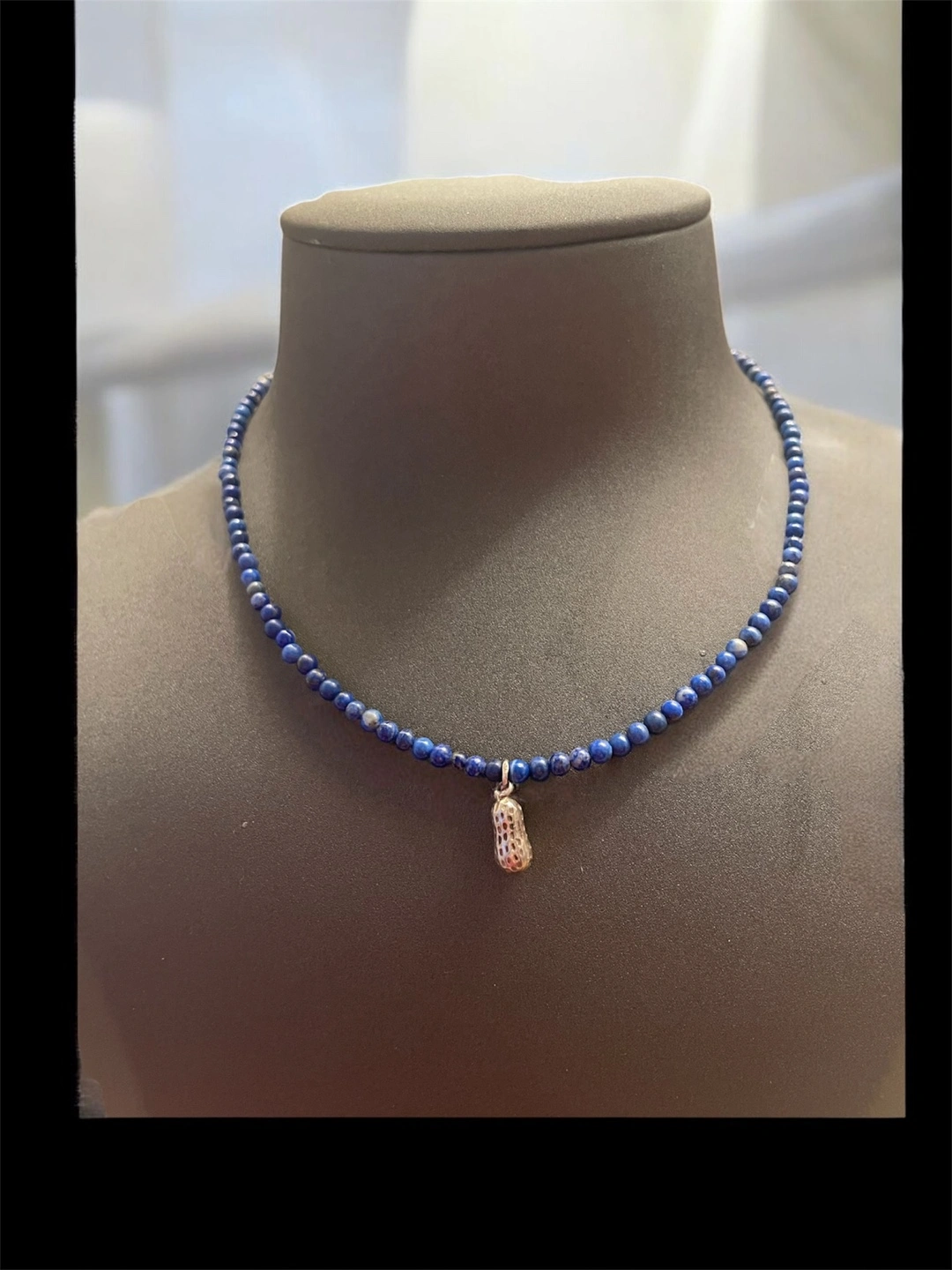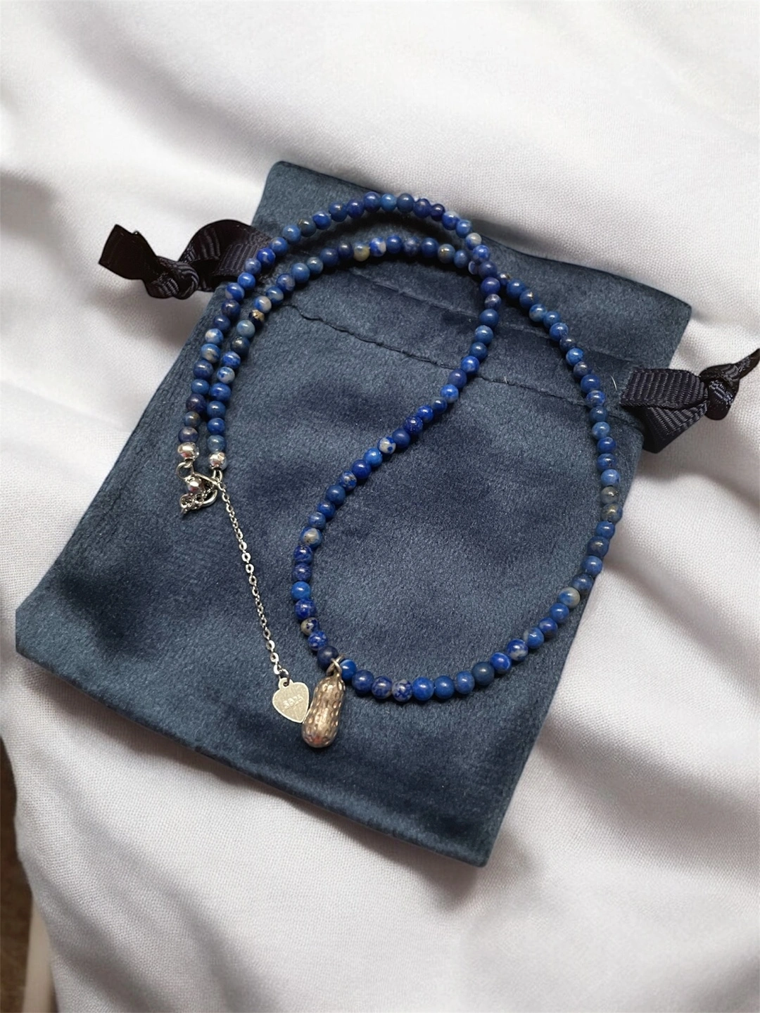 Lapis Lazuli Beaded Necklace with 925 silver Peanut Charm