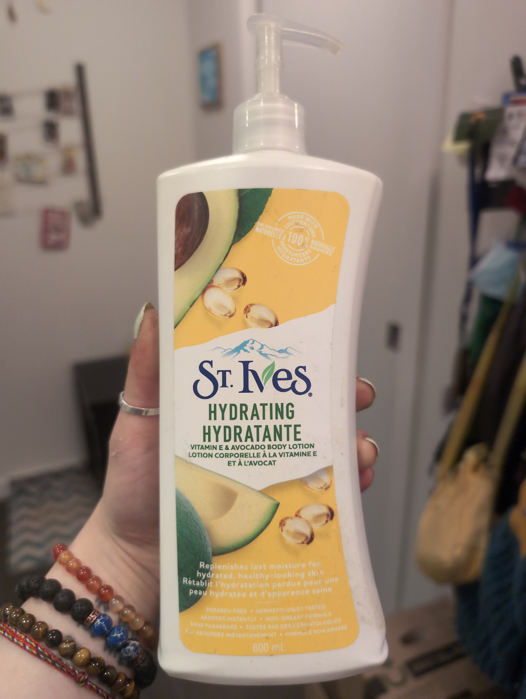 Open 600ml bottle of St. Ives Hydrating body lotion. Vitamin E & Avocado. Replenishes lost moisture for hydrated, healthy-looking skin. Absorbs instantly. Non-greasy formula.