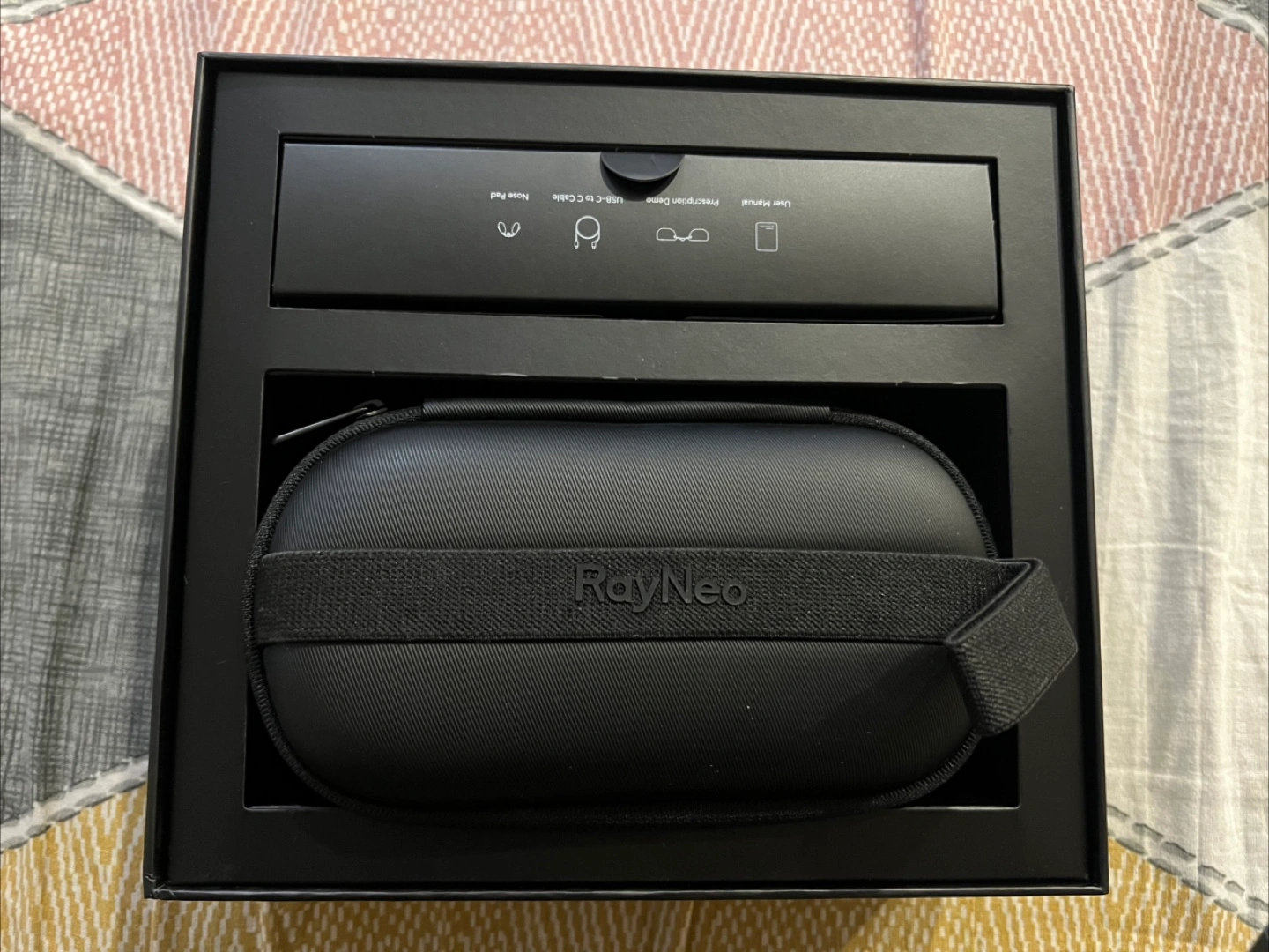 Brand new RayNeo X smart glasses. Sleek, black frame. Includes charging case and all original packaging. Bone conduction audio technology. Excellent condition.
