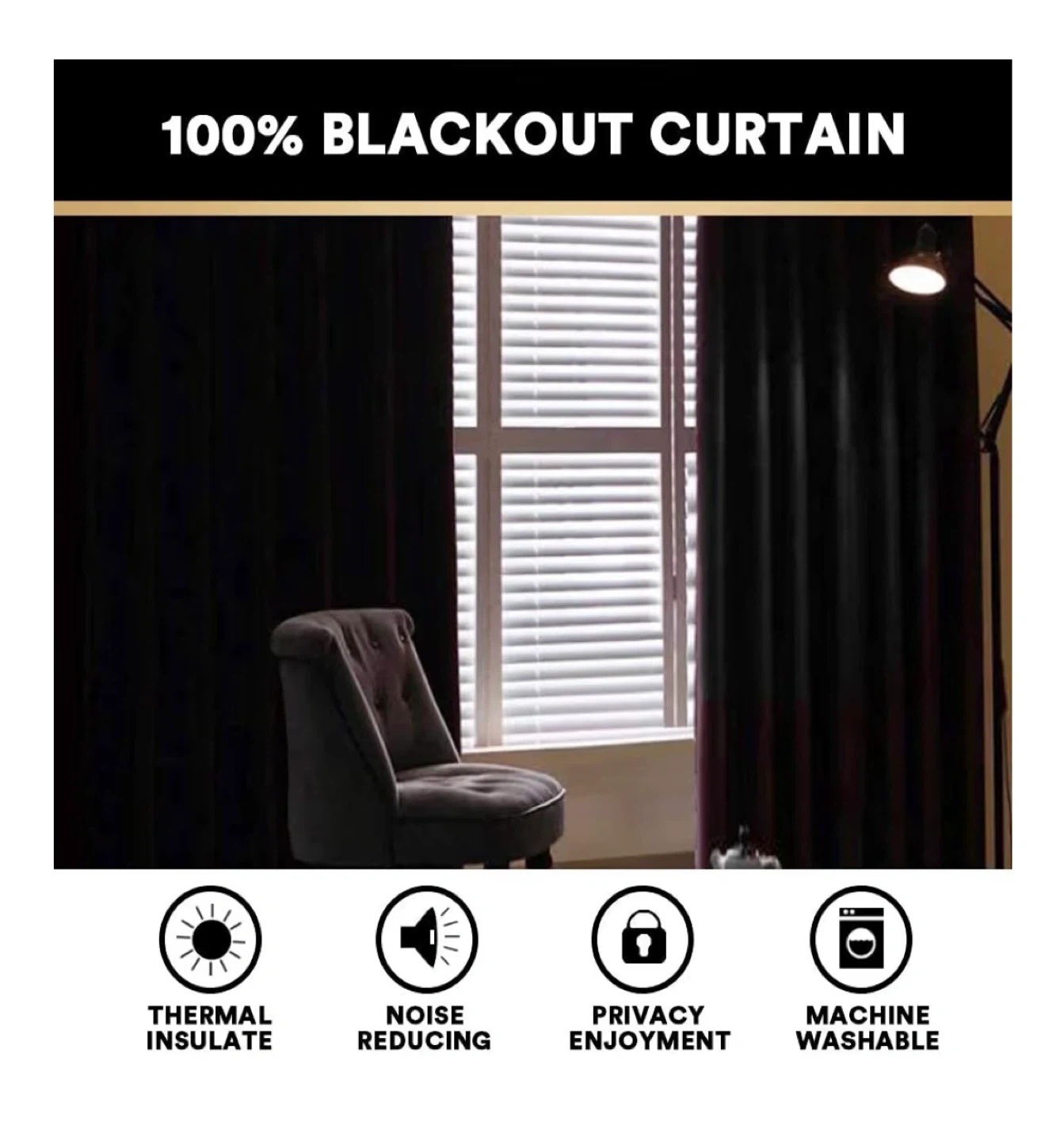 These blackout curtains offer 100% light blocking for a dark room. They're made with heavy, water-repellent fabric and are machine washable. Each panel measures 52" wide and 84" long. They provide thermal insulation and noise reduction.