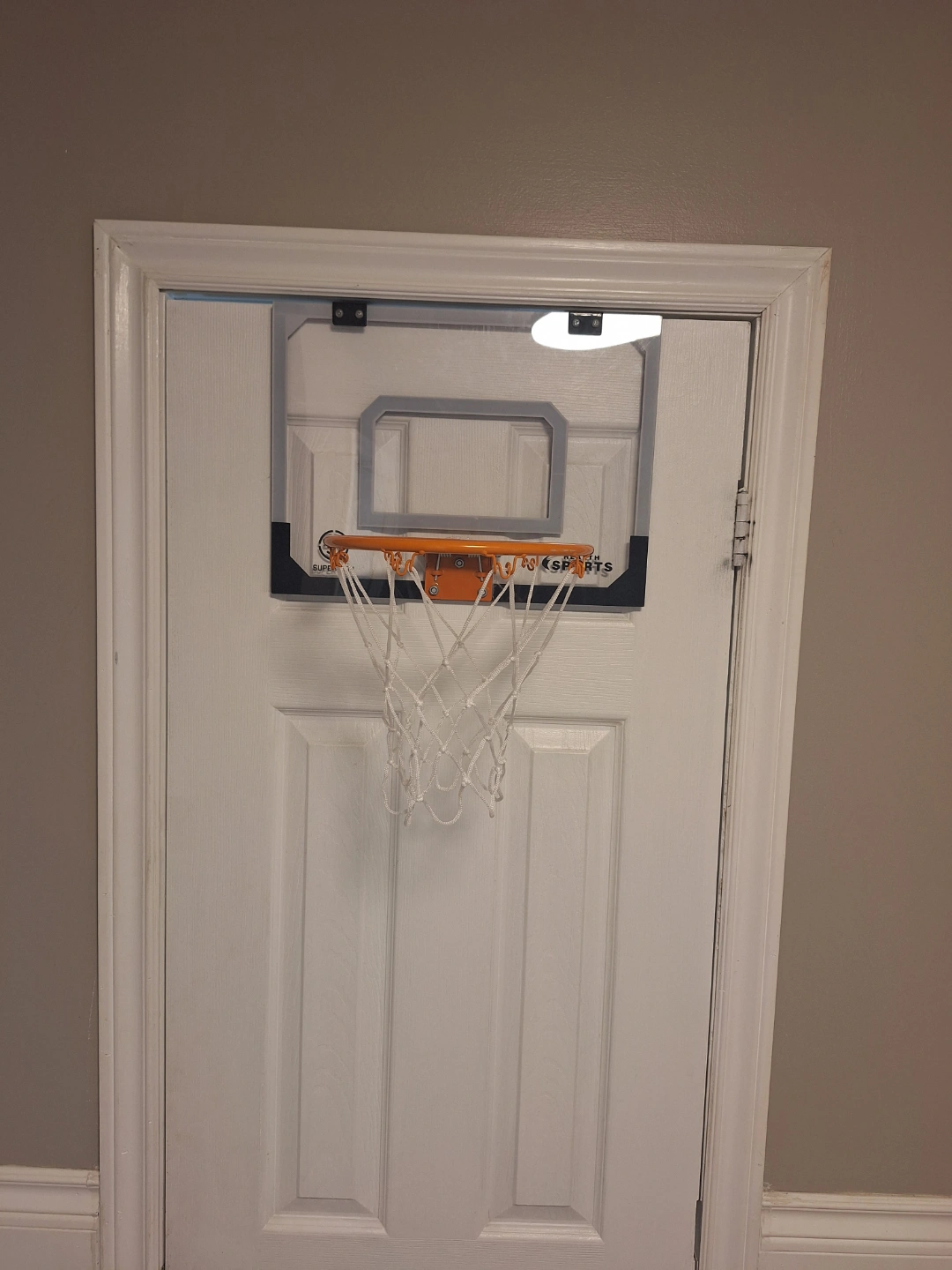 Miniature basketball hoop. Mounts over door. Includes backboard and net. Great for kids. Fun indoor activity. I might be able to find the ball.