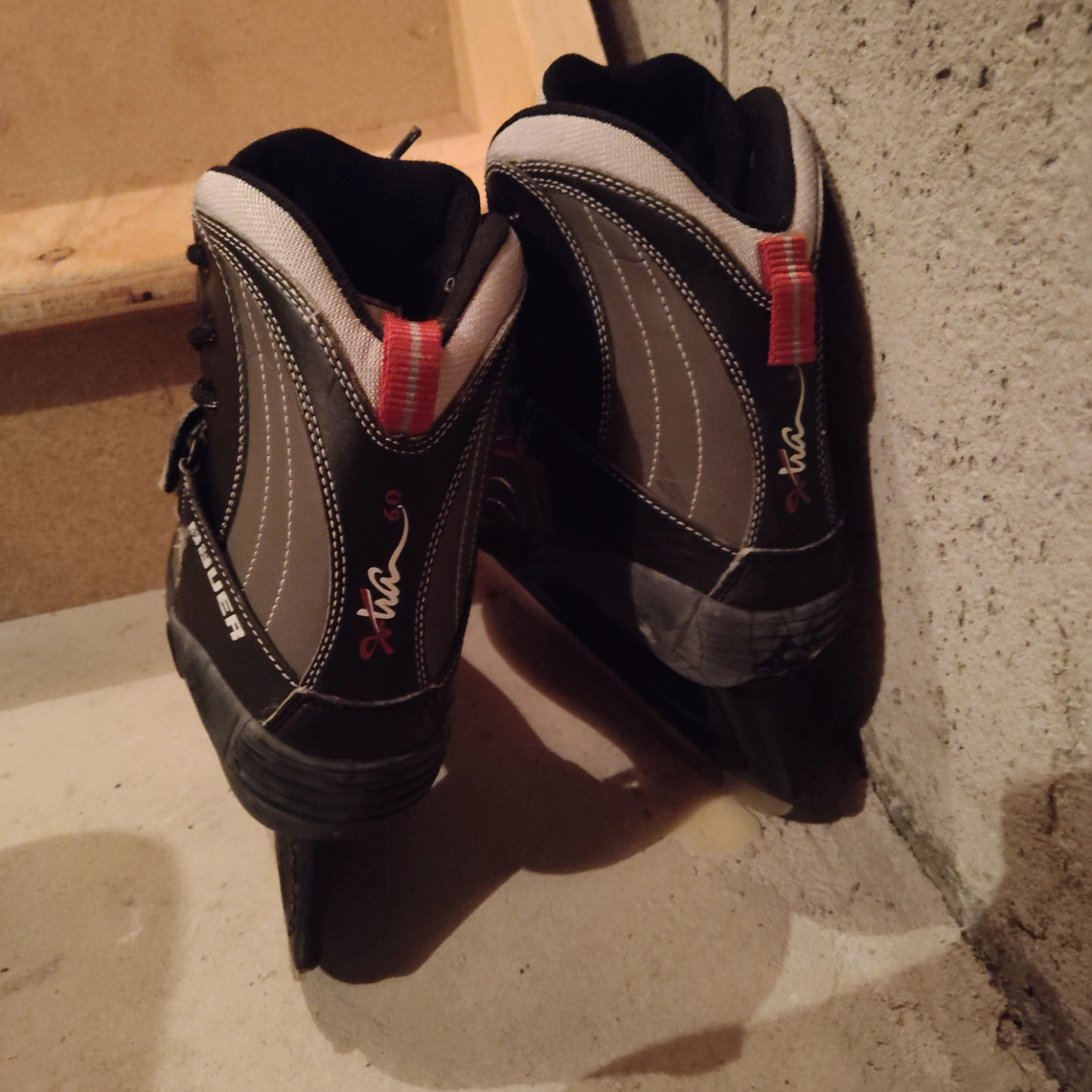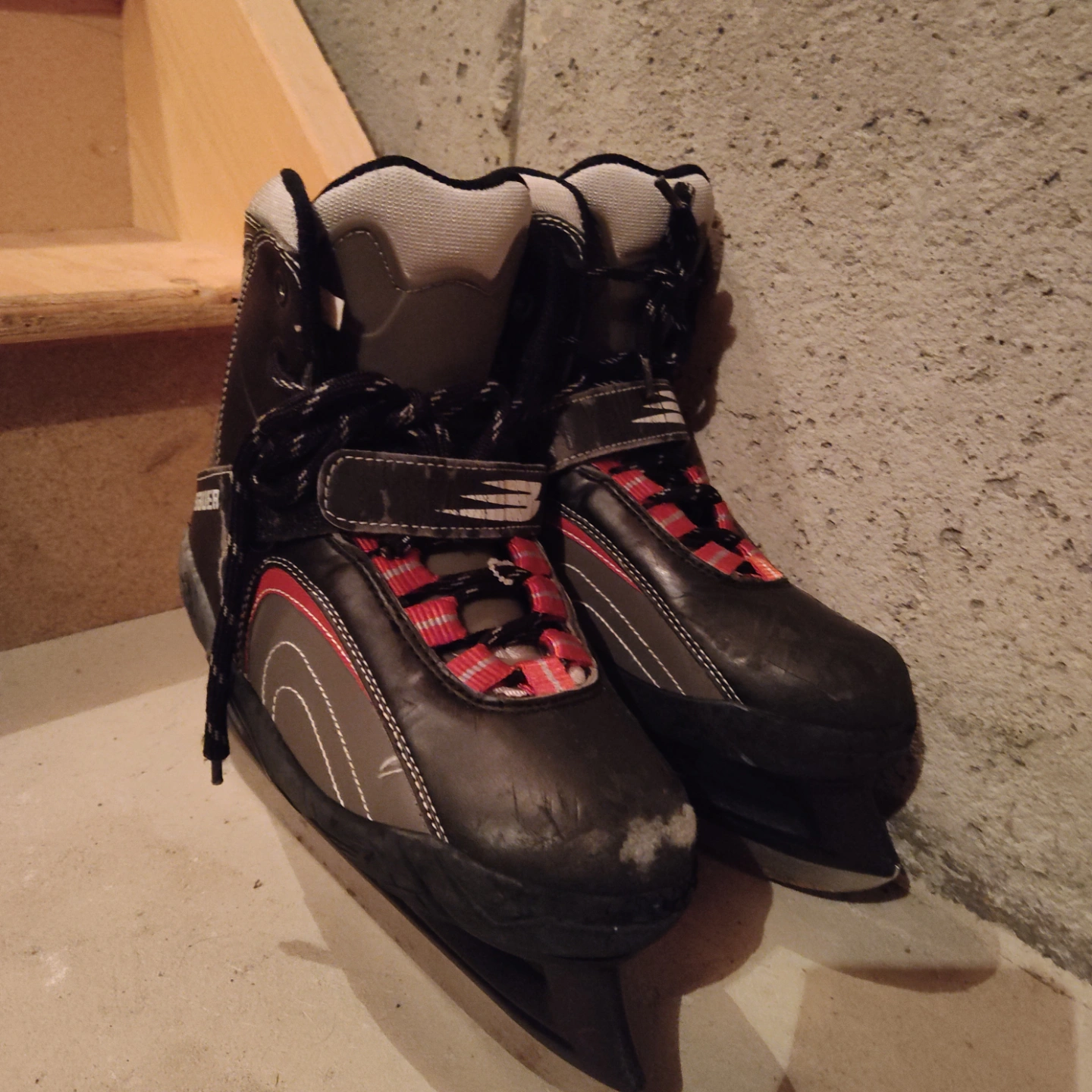 Used Bauer youth ice skates. Black, grey, and red accents. Adjustable closures. Good for recreational use.