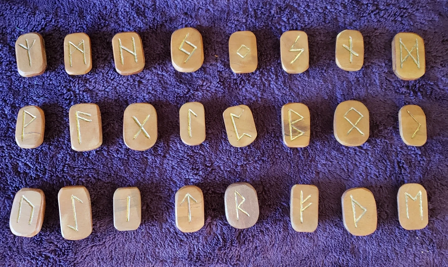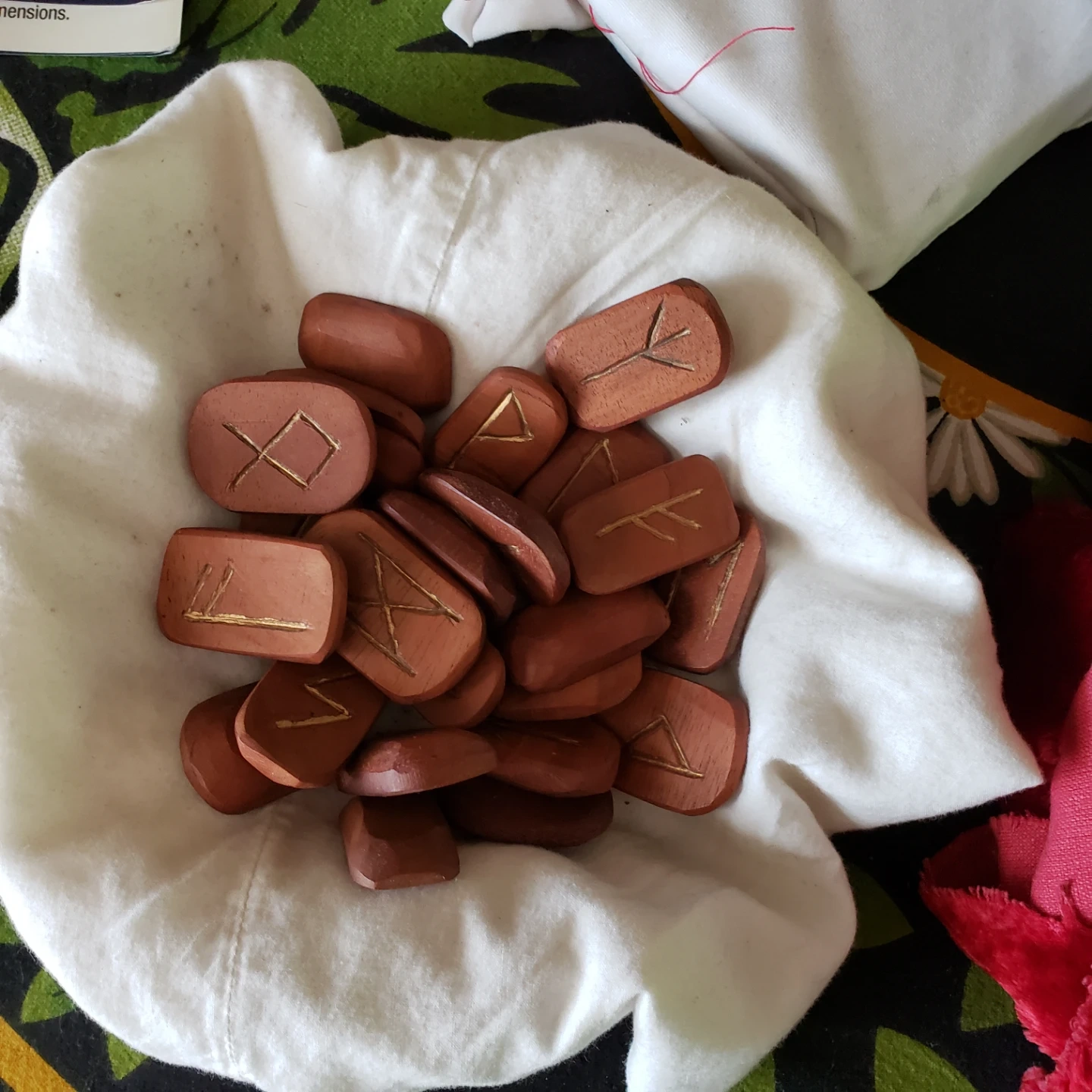 Hand crafted by me with local Cherry wood. Twenty-four wooden rune stones. Each stone features a unique Elder Futhark rune in gold. Perfect for divination or meditation. Small and portable. I also offer a free natural materials bag.