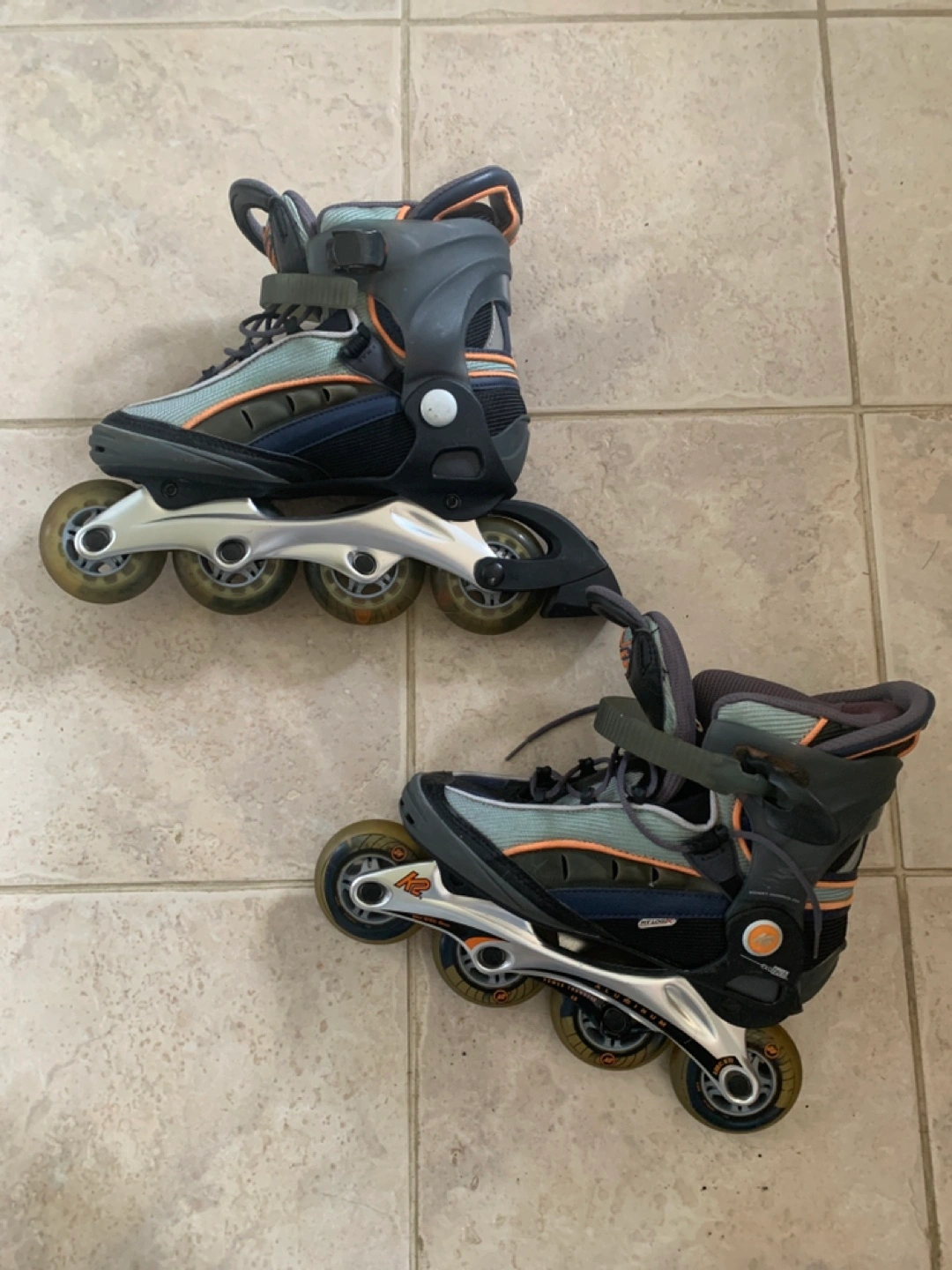Gently Used K2 Xcelerate inline skates. Women's size 8.0. Four wheels per skate. Grey, blue, and orange colours. Good condition