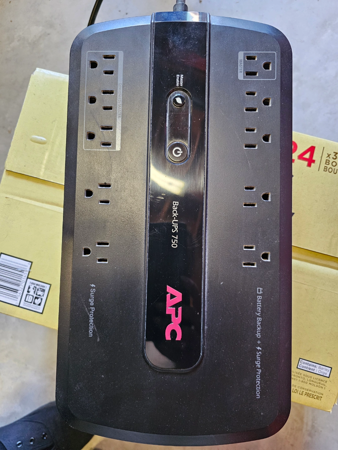 182Used APC Back-UPS 750. Battery backup and surge protection. Multiple outlets. Network and cable connections. Power cord included.