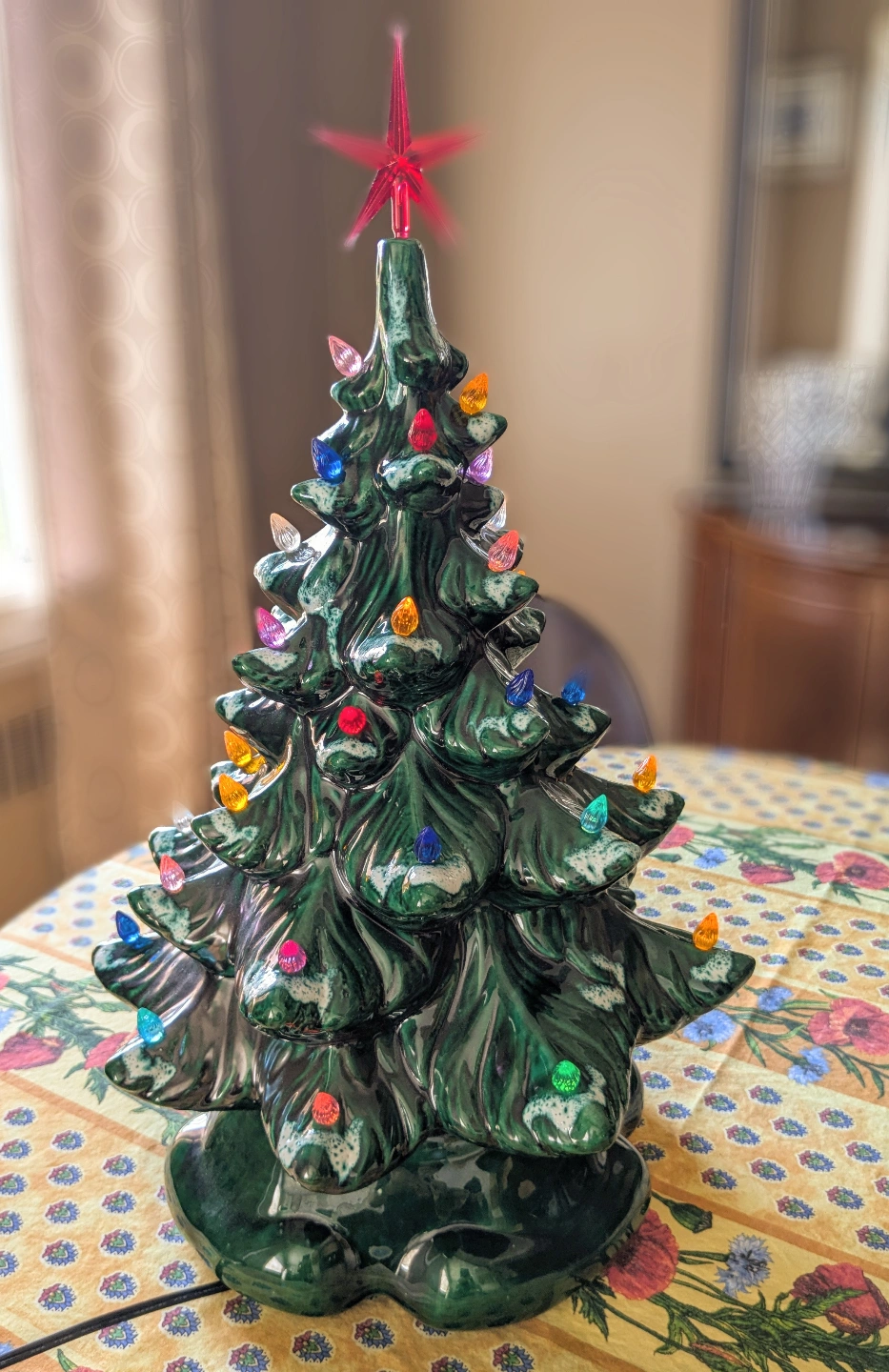150Green ceramic Christmas tree - electric. Features colourful lights and a red star. VERY collectible holiday décor.