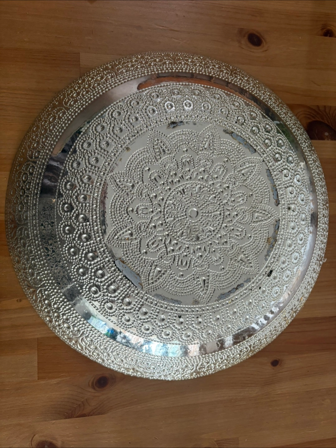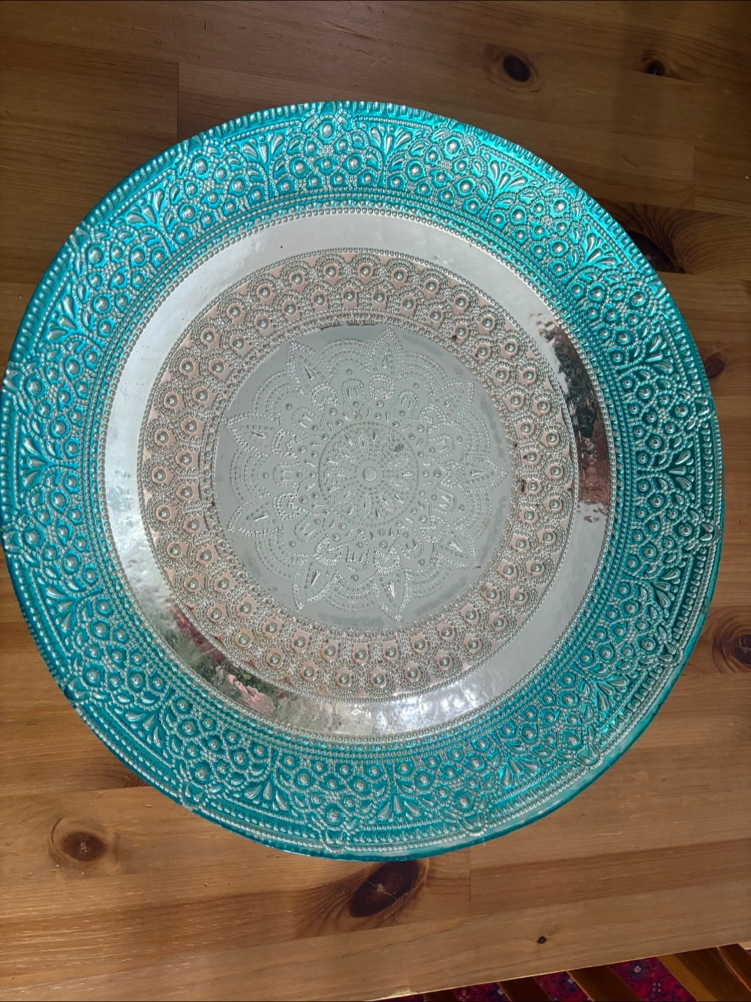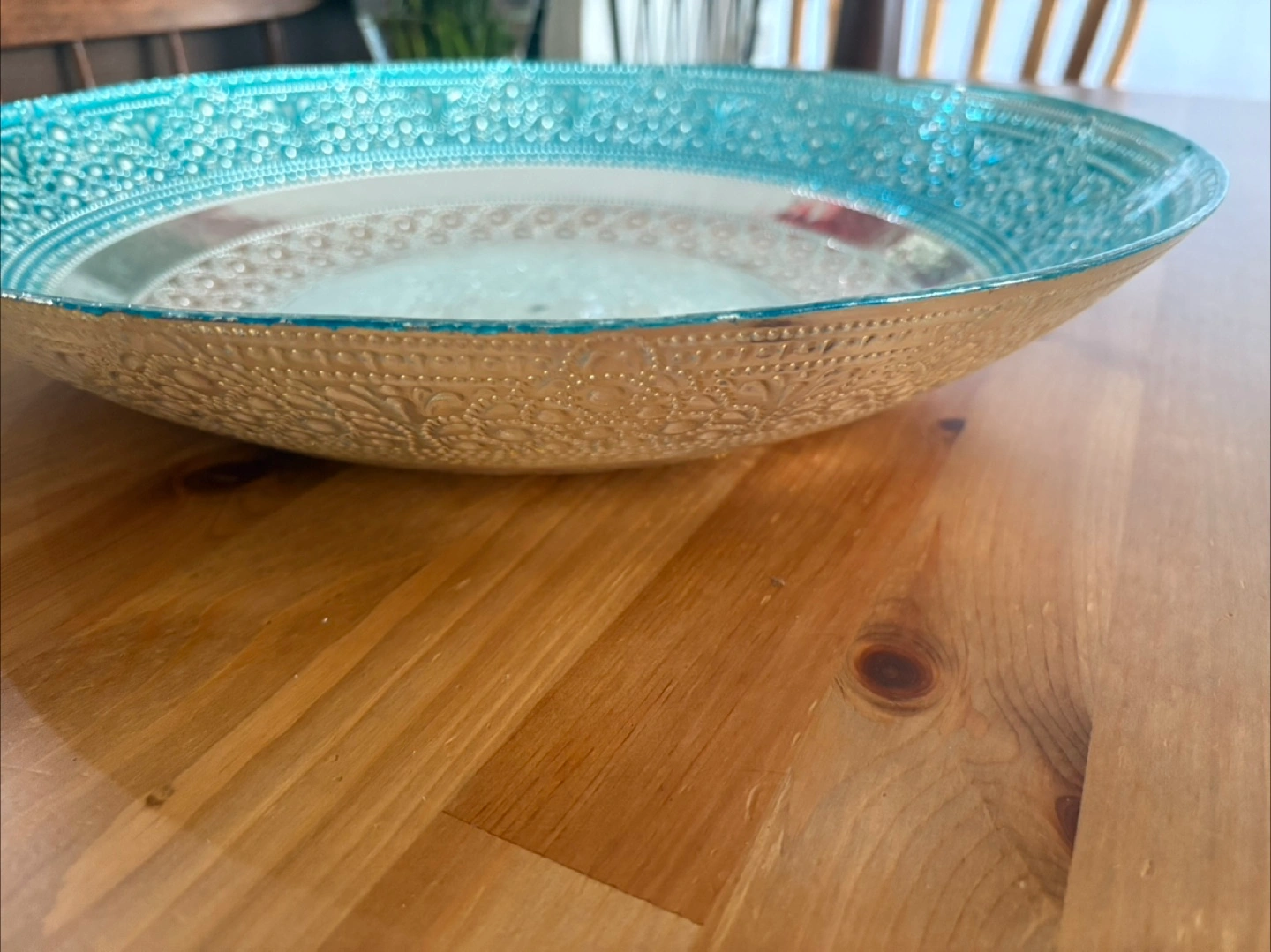 563Large decorative glass bowl. Teal and silver design. Intricate detailing. Perfect for fruit, keys, or decorative purposes. 16 Inches