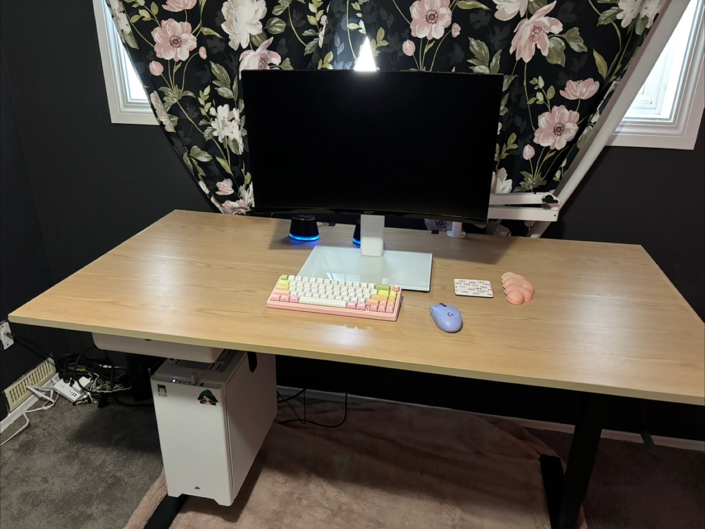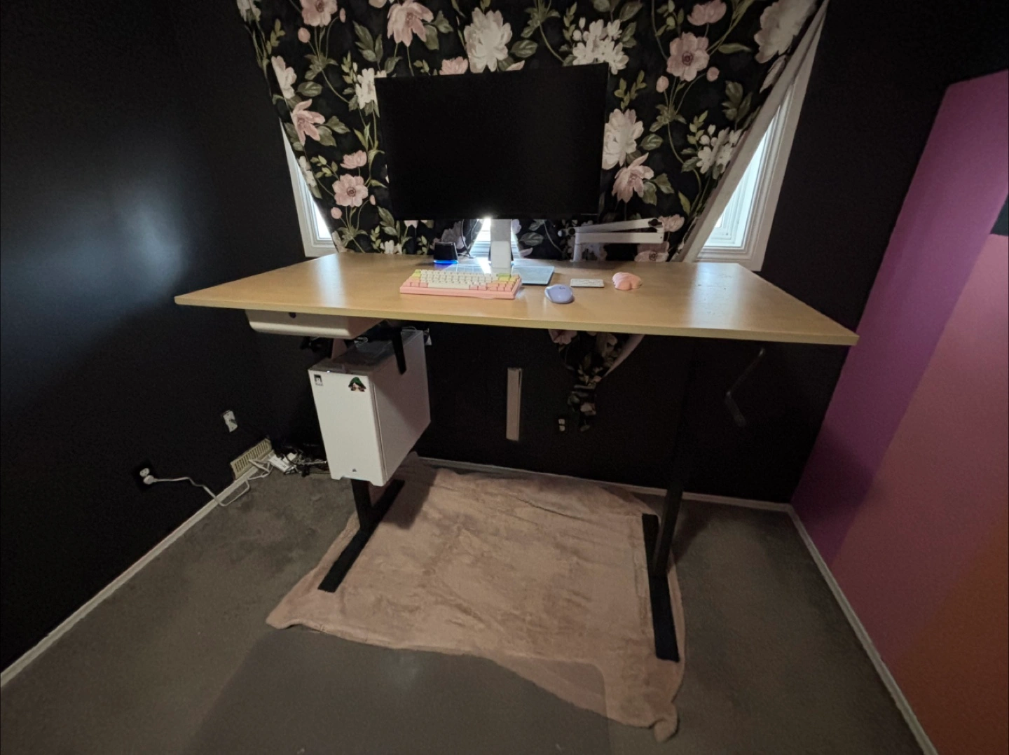 IKEA standing desk. It is a manual, crank desk that’s minimum height is 27 inches and goes up to a max height of 47 inches.