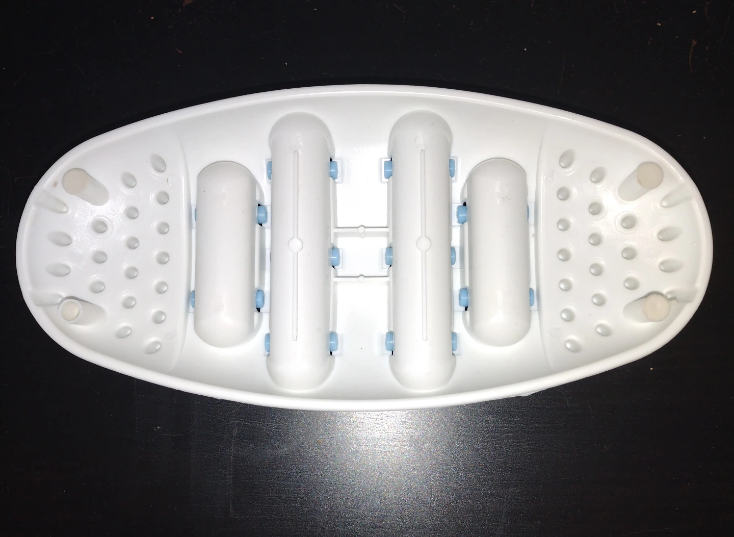 1000+White plastic foot roller massager. Features multiple rotating balls and textured knobs. Great for foot reflexology.