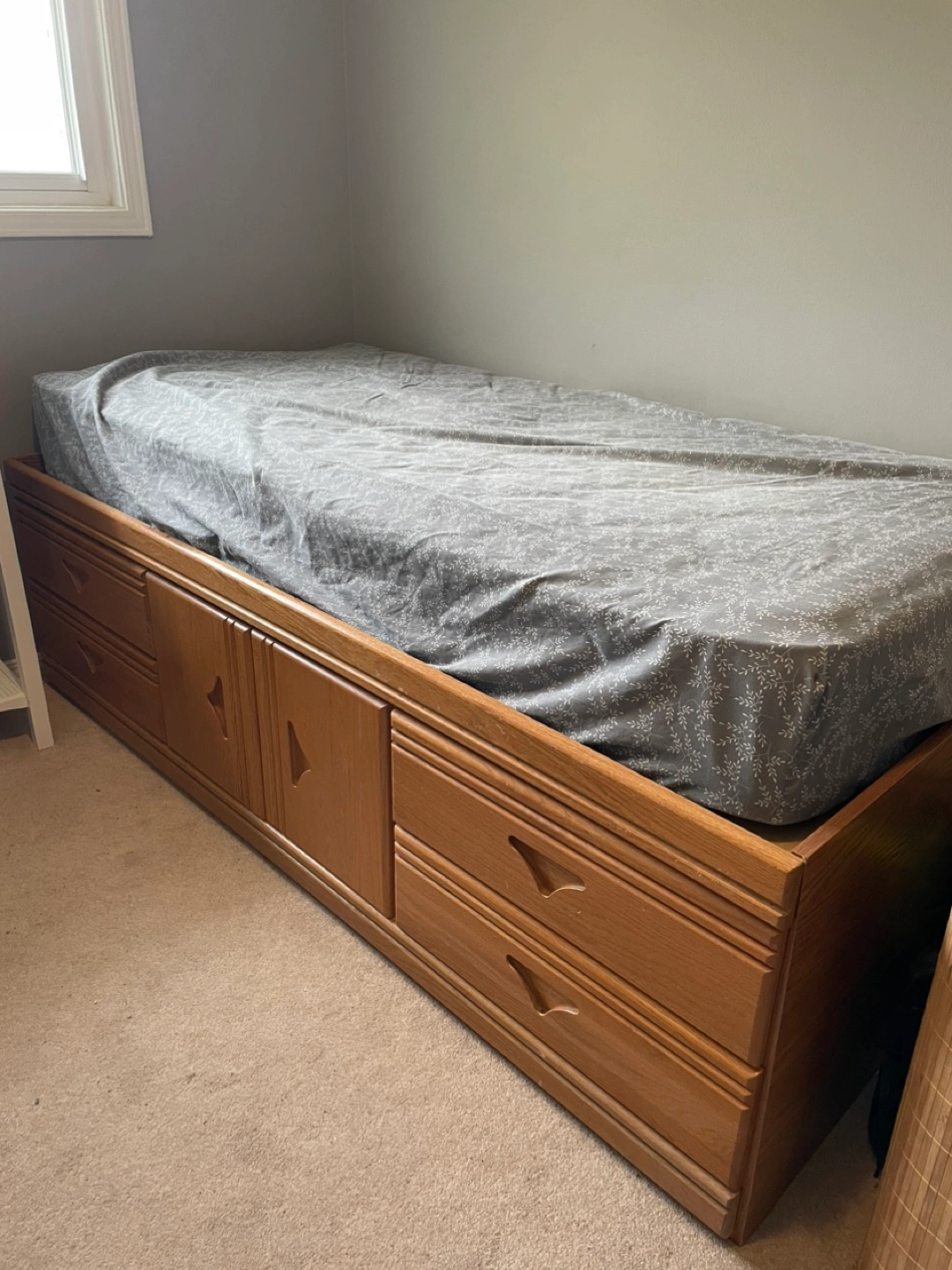 Wooden twin-size bed frame including mattress in good shape. Features multiple drawers for storage. Solid wood construction. Need 2 people to remove from upstairs.