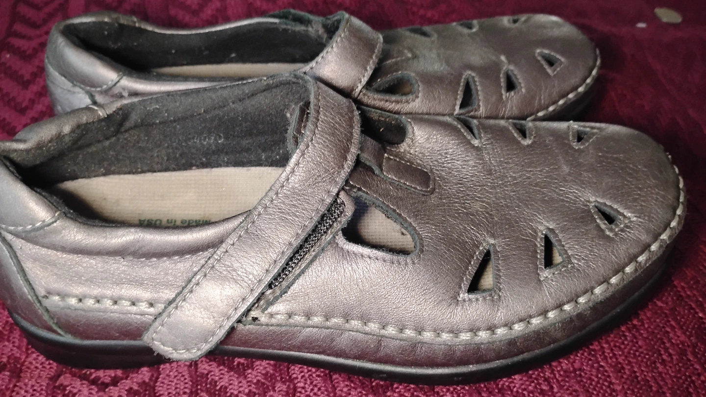 Girls grey leather sandals. Made in the USA. Features a strap and laser cutouts. Good for summer. Size 6 girls