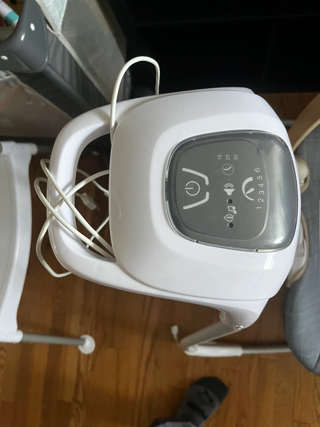 Infant swing, grey fabric, wooden mobile bar, two plush toys. Features multiple swing speeds and soothing sounds/songs. Good used condition.