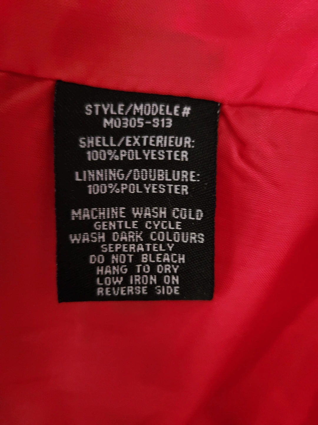 Red trench coat. Size medium. Belted waist. Long sleeves. Classic style. 100% polyester shell and lining. Machine wash cold.