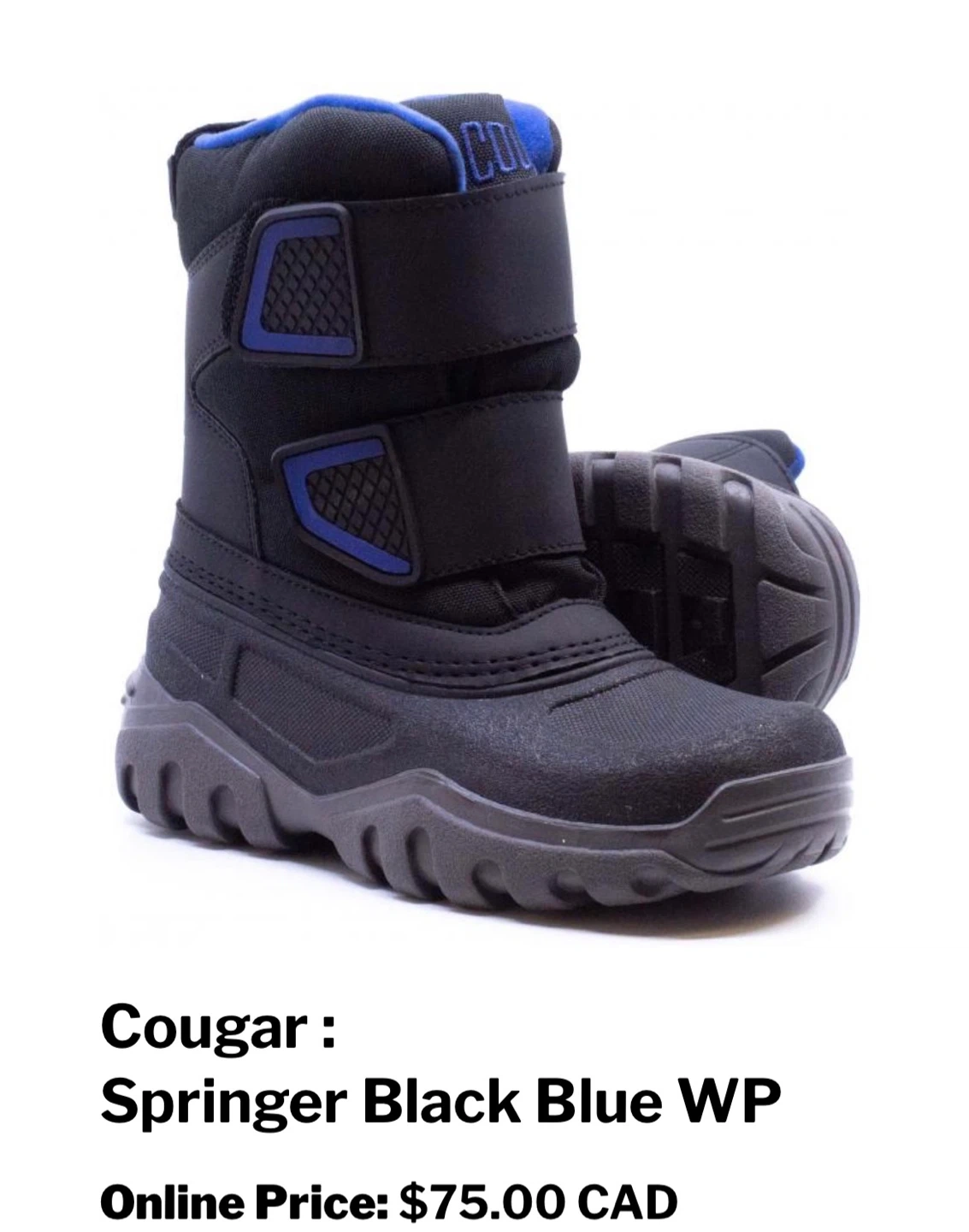 Buy & SellKids Cougar Springer Black Blue WP BootsKids Cougar Springer Black Blue WP Boots$15Selling a pair of Cougar Springer winter boots in black and blue. These boots are waterproof and ready for the snow! Size 11ConditionGoodAge3-5 yearsWHERE TO MEET3 Market StreetView MapSELLERverifiedValeriaKing East11423 reviews0 chats·0 favorites·18 viewsSEND CHAT TO SELLERHi Valeria! I’m interested in your listing.Hi Valeria! I’m interested in your listing.Get the Karrot app to chatSign In to chat