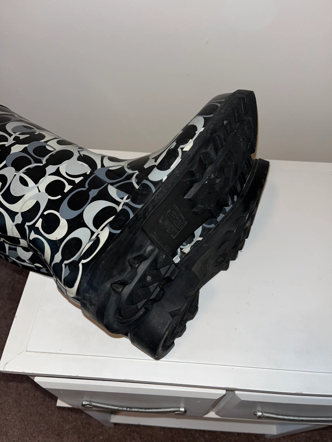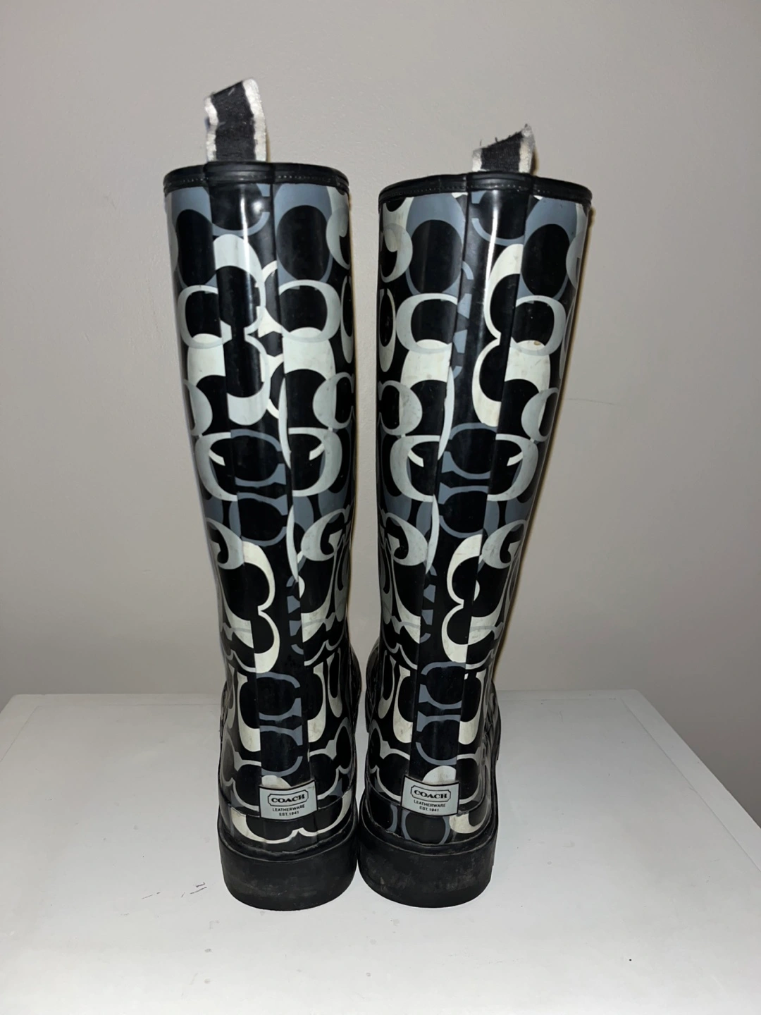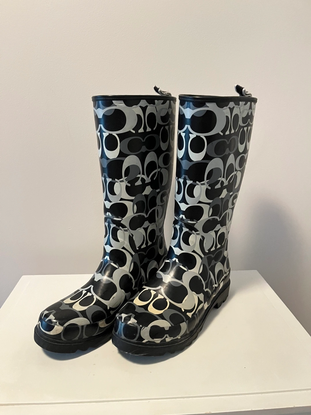 Pair of Coach rain boots. Black and grey pattern. Excellent condition.