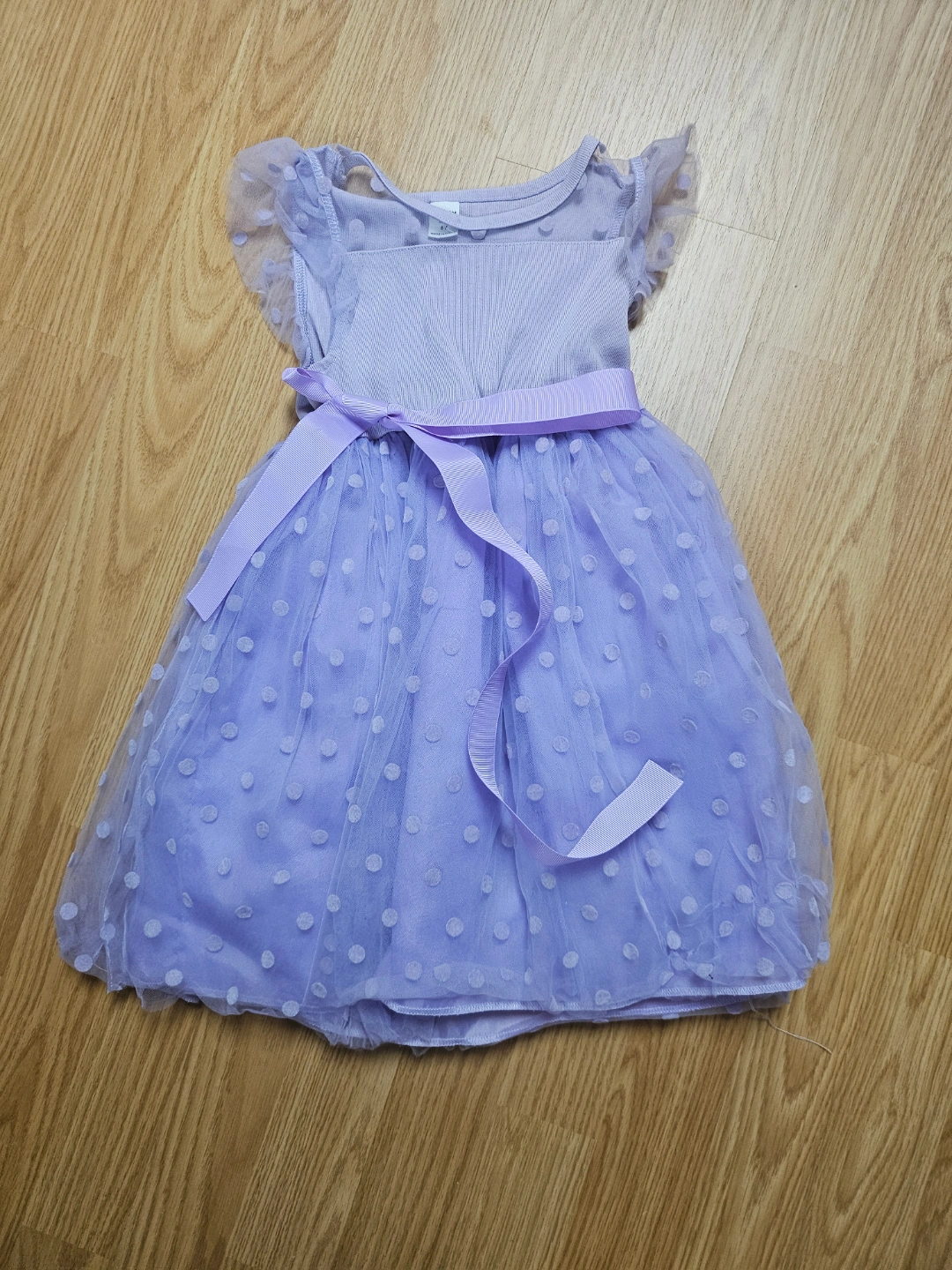 Adorable lavender polka dot tulle dress. Features a fitted bodice and a full tulle skirt. Perfect for parties or special occasions. Size 6