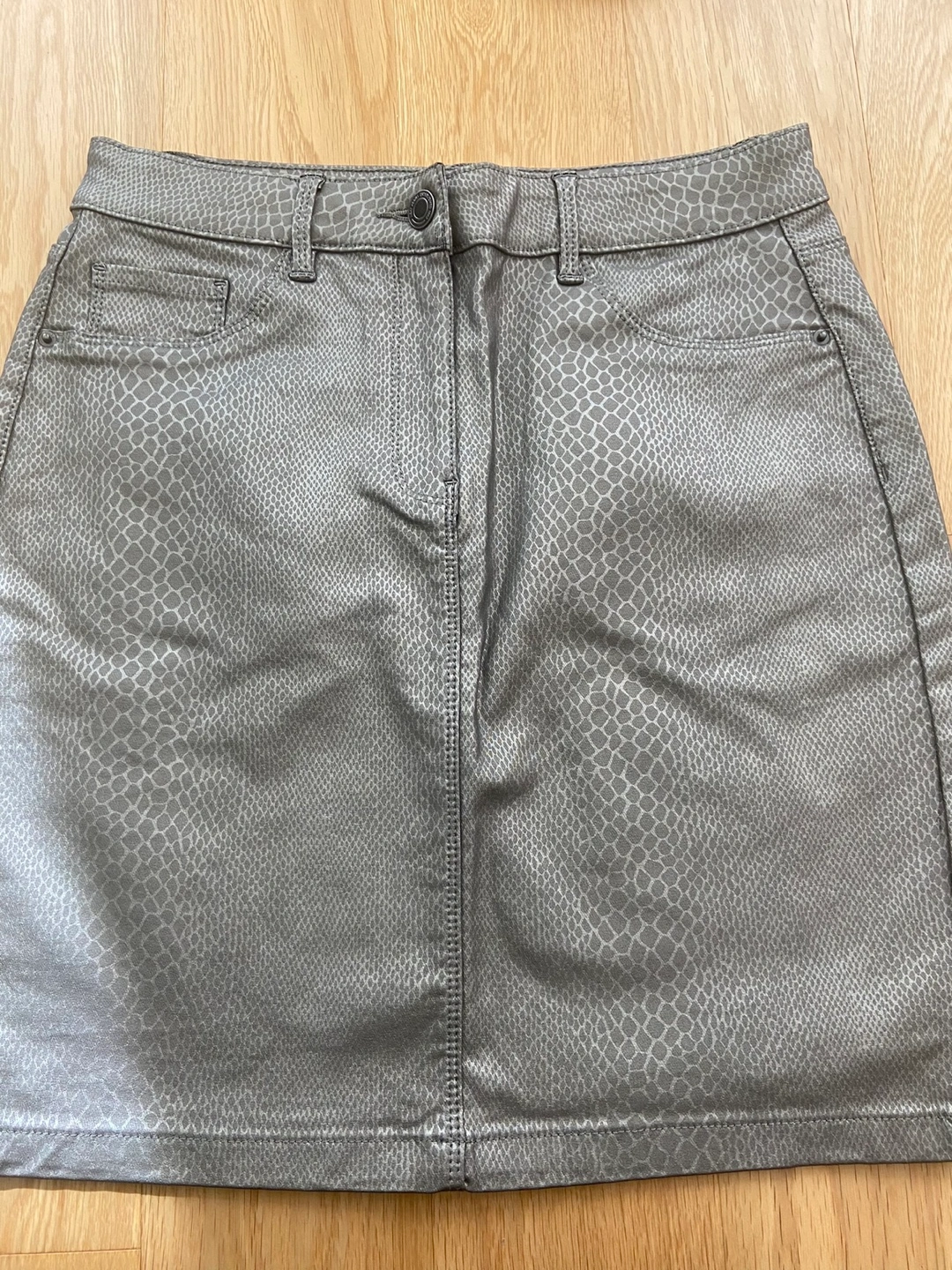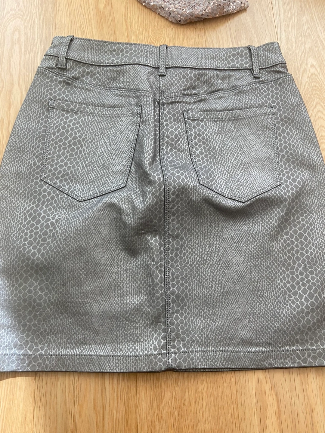 Grey snakeskin mini skirt. Zipper and button closure. Two front pockets, two back pockets. Fabric feels like a coated denim.