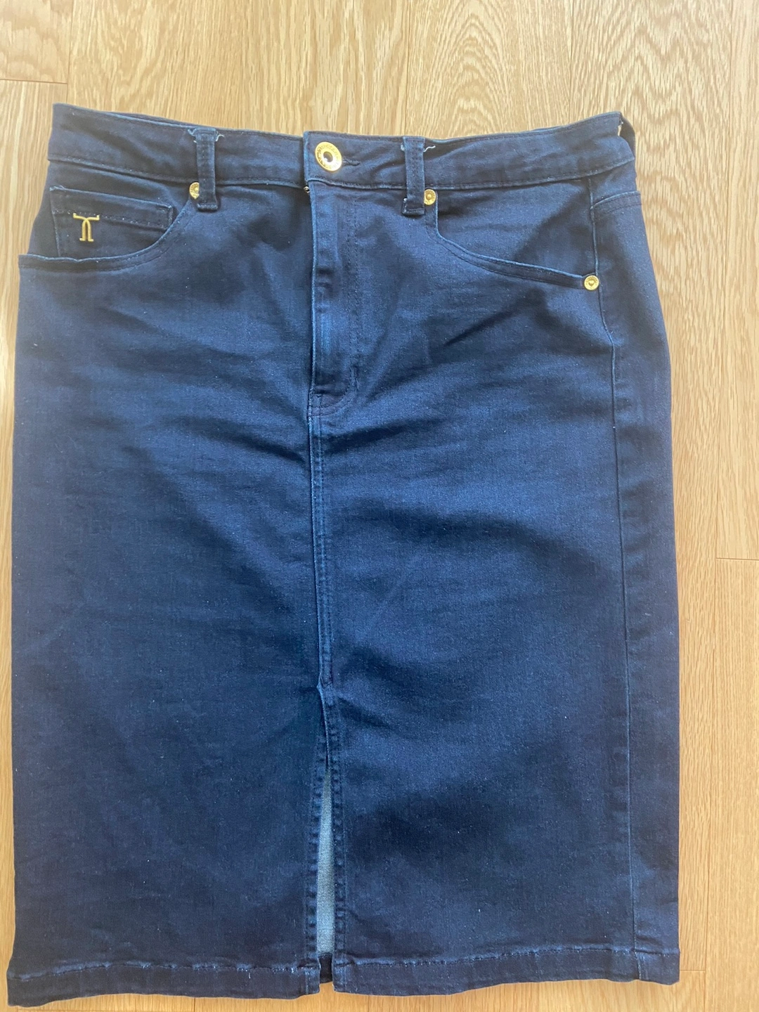 Dark wash denim pencil skirt. Features a centre front slit. Classic style, great for work or casual wear. Size not specified.