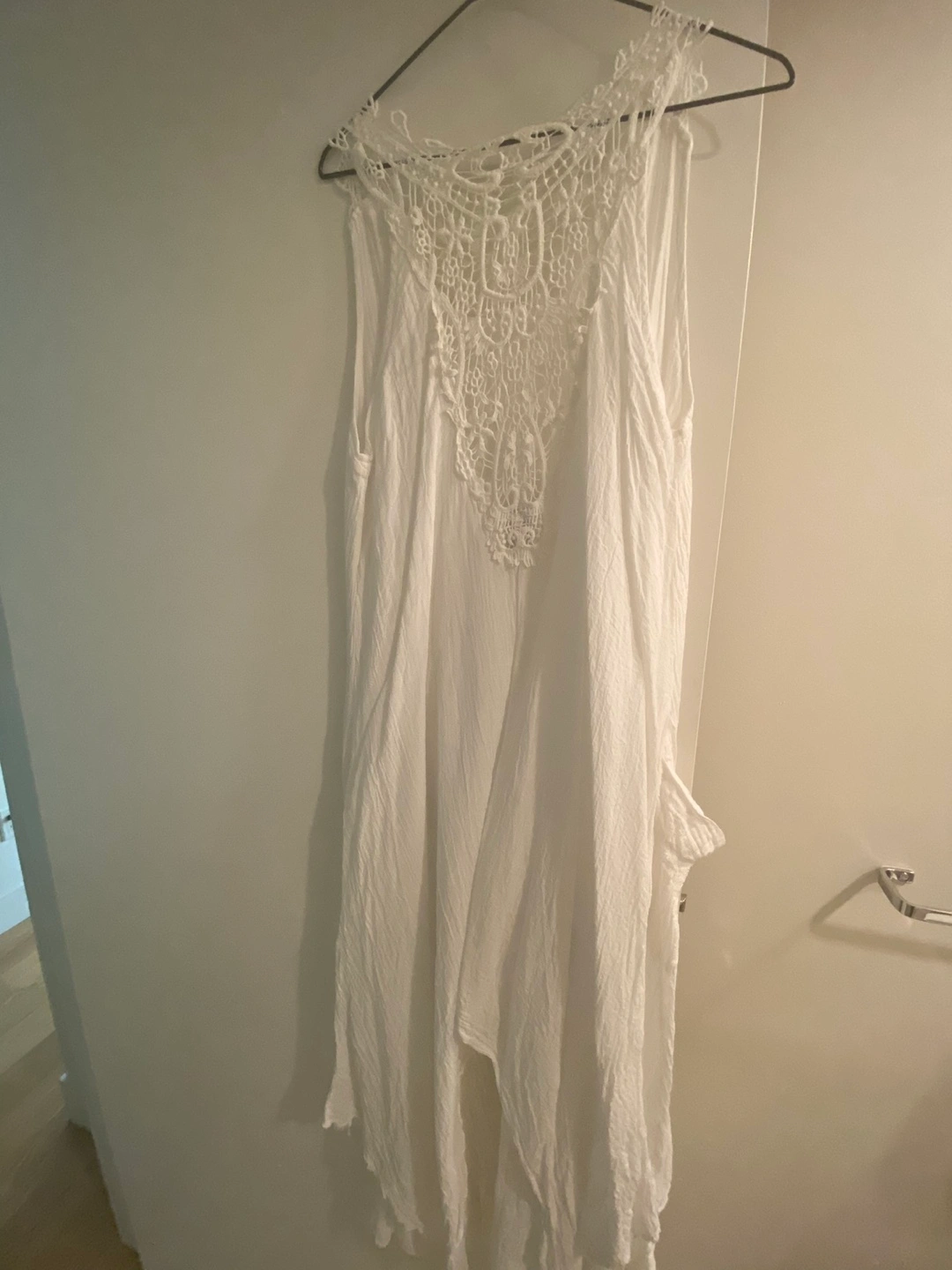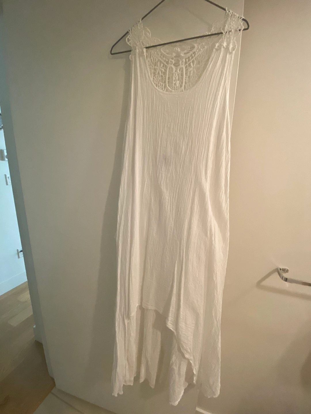 Flowy sleeveless maxi dress. High-low hemline. Features beautiful crochet detailing on the back and shoulders. Lightweight and breathable fabric, perfect for warm weather. Pure Greek cotton.