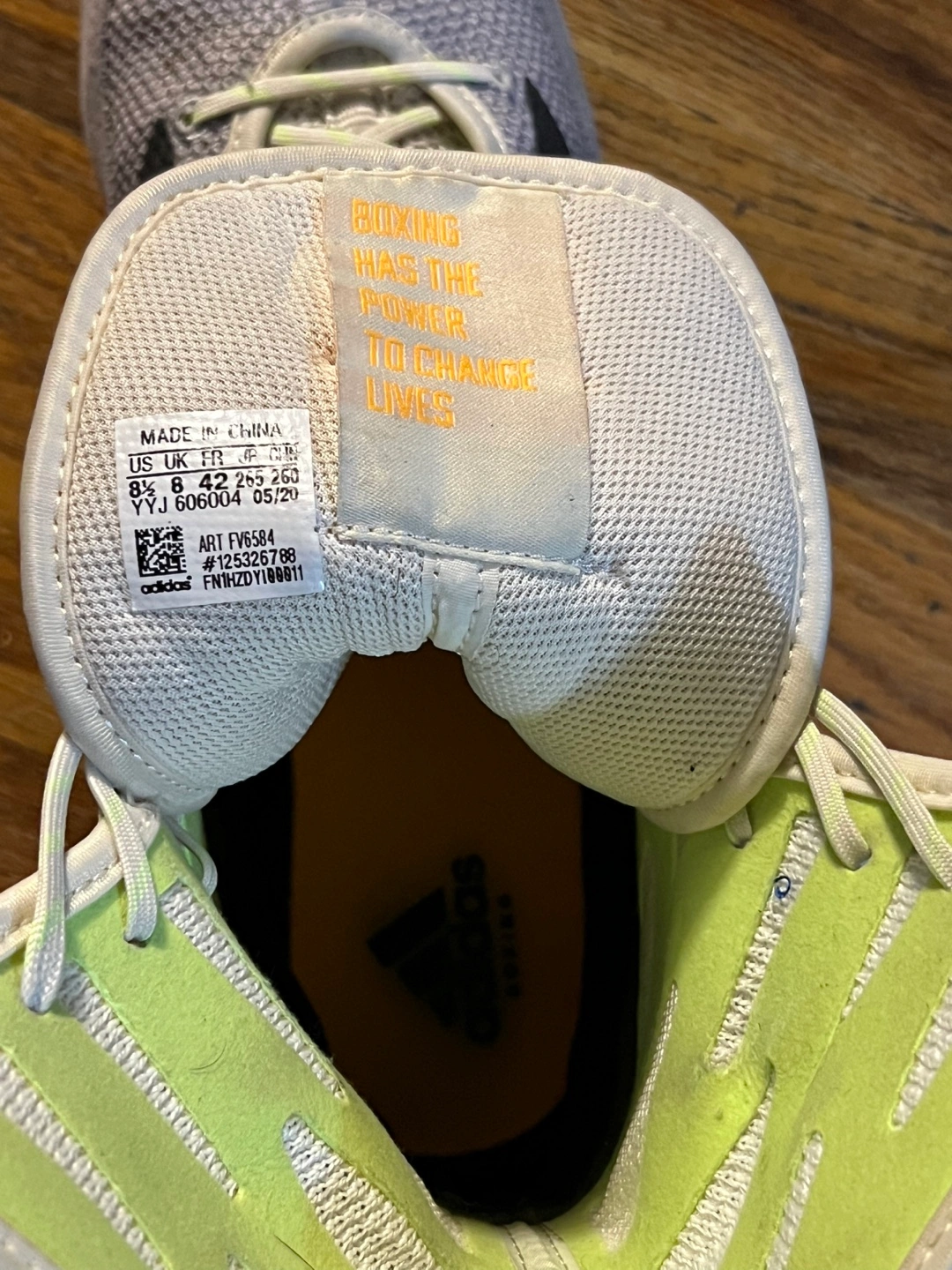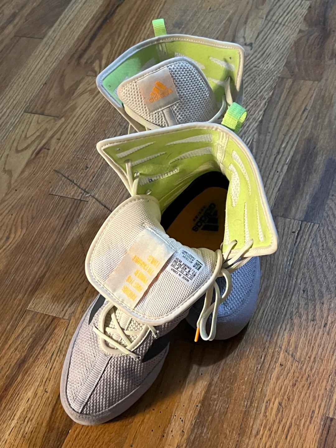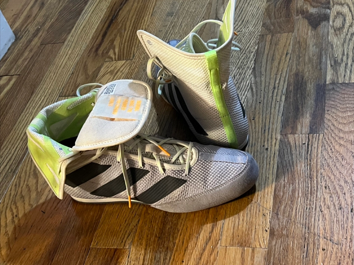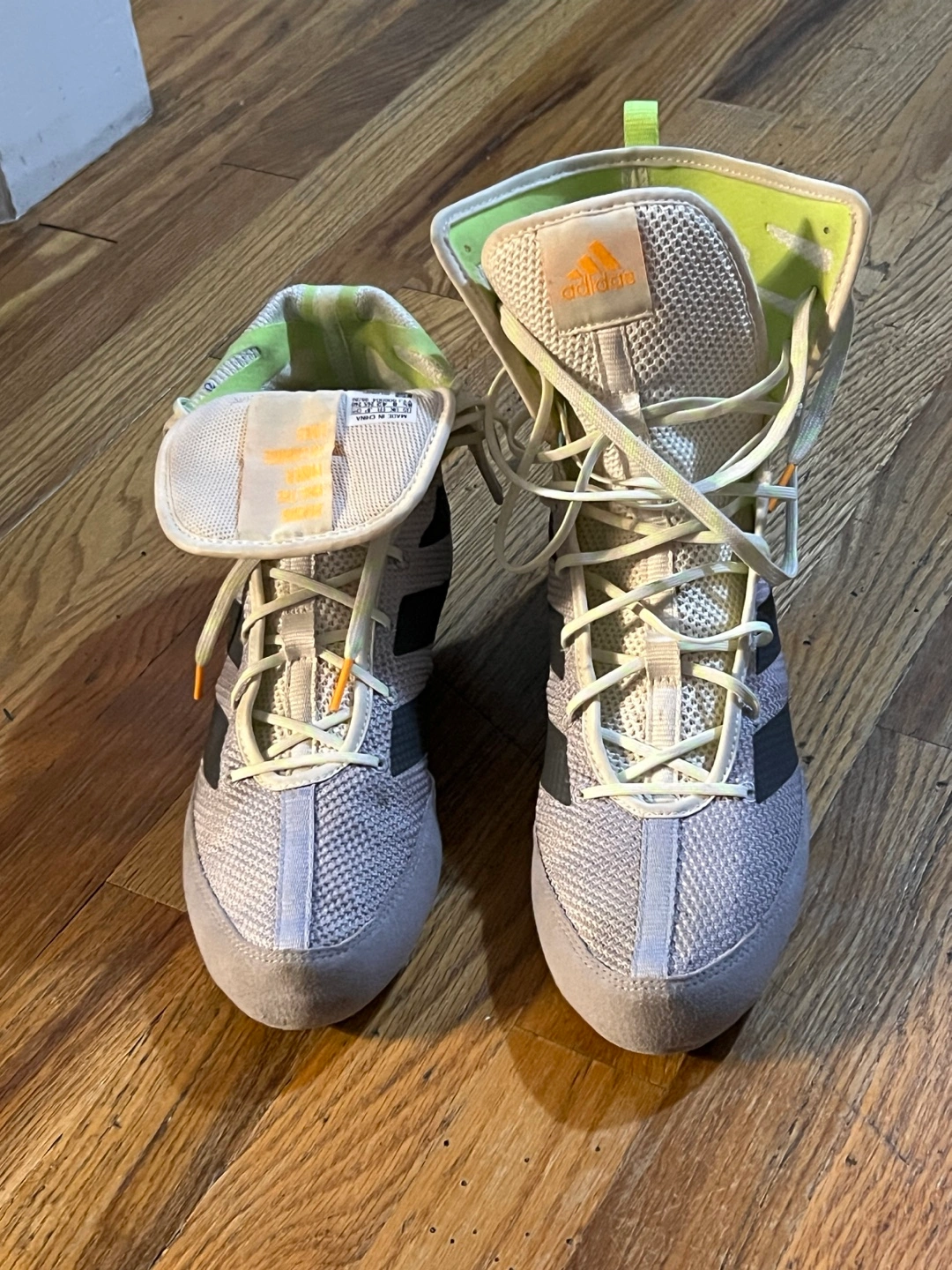 Adidas boxing shoes. High-top design. Gray and white color scheme. Lime green accents. Lace-up closure. Good ankle support. Worn but in great condition.