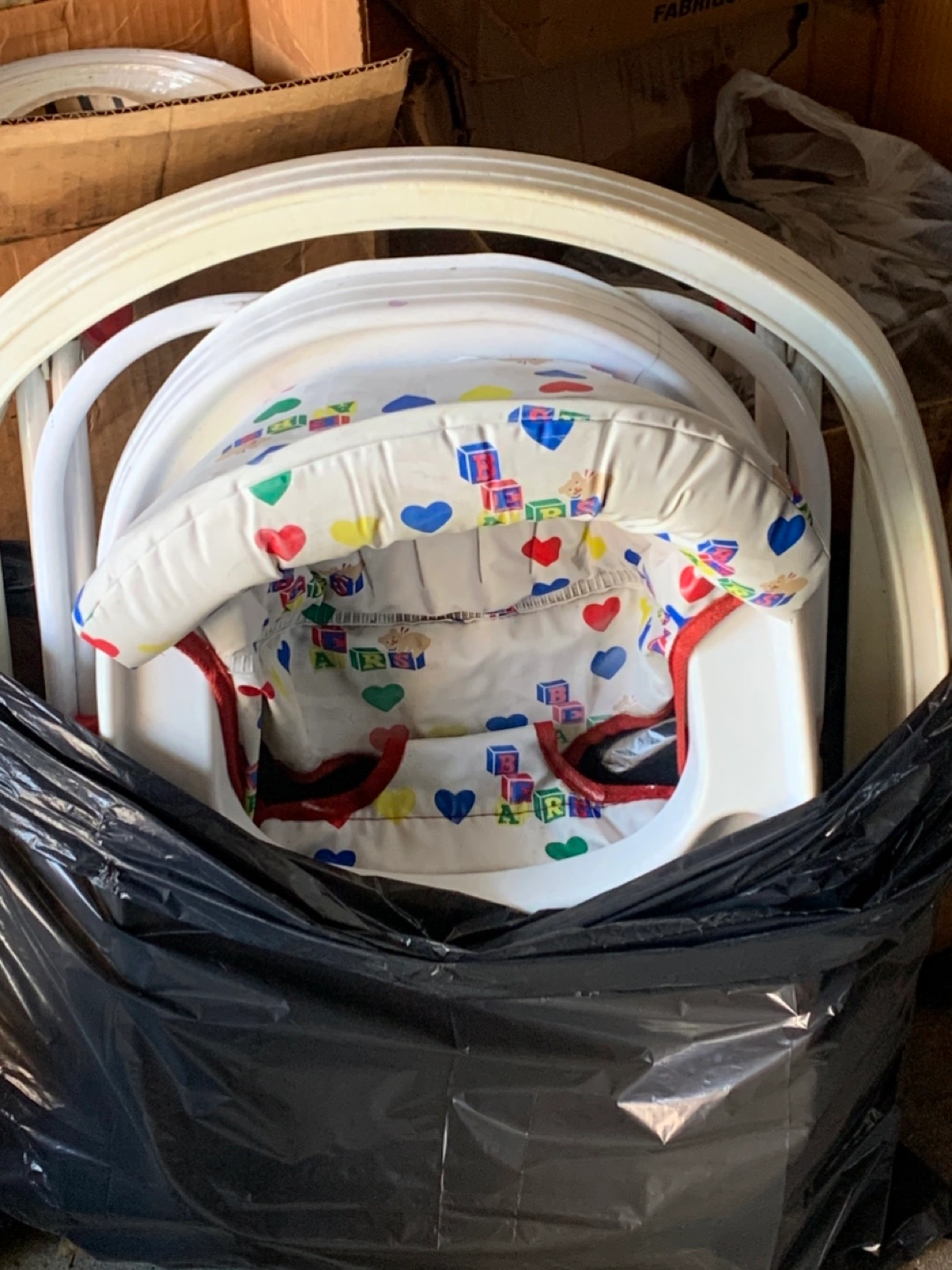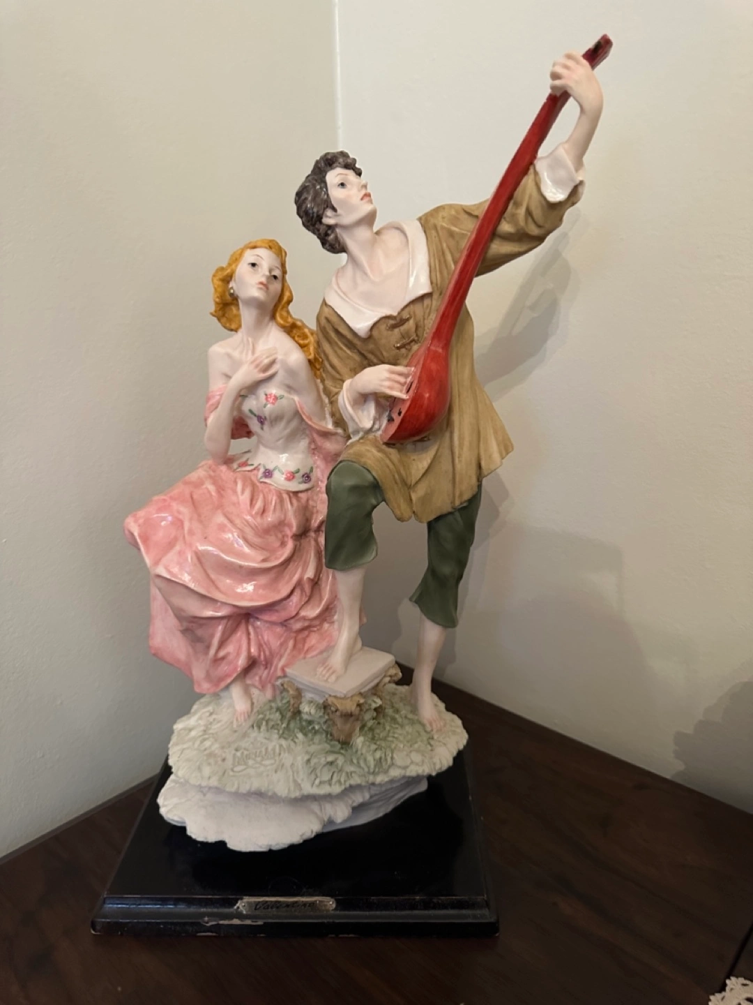Infant walker, colourful pattern. Requires assembly. Large figurine, man and woman, musical theme. Looks like porcelain. Black base.