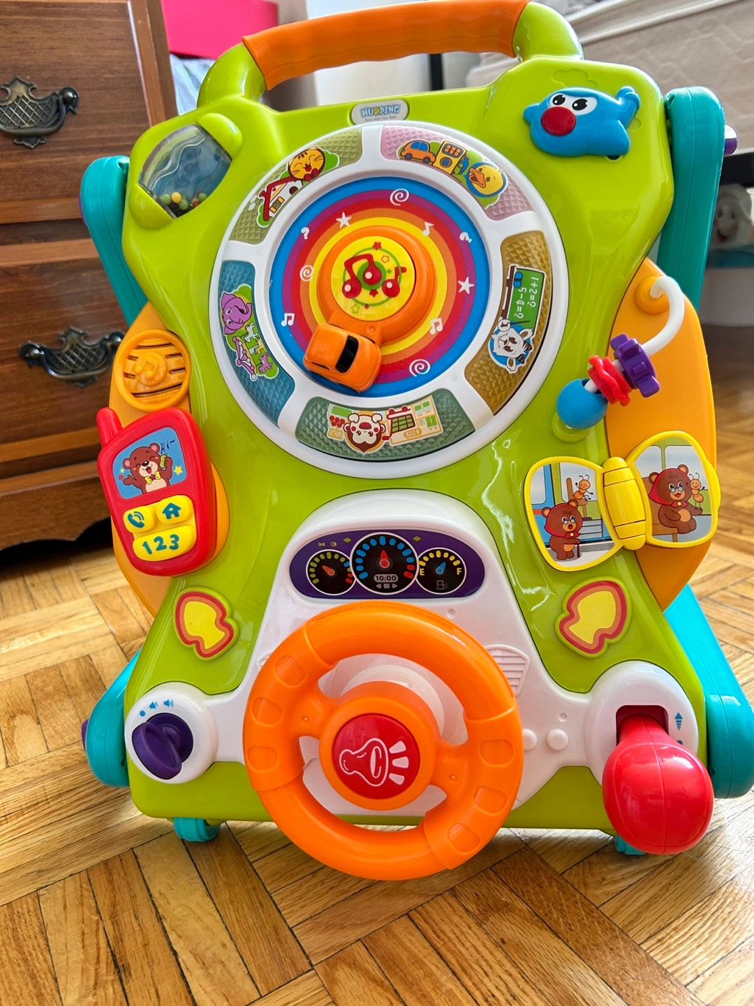Fun and colourful activity walker. Features a steering wheel, activity panel, and drawing board. Great for toddlers learning to walk and play. Bright colours and engaging activities. Foldable for storage.