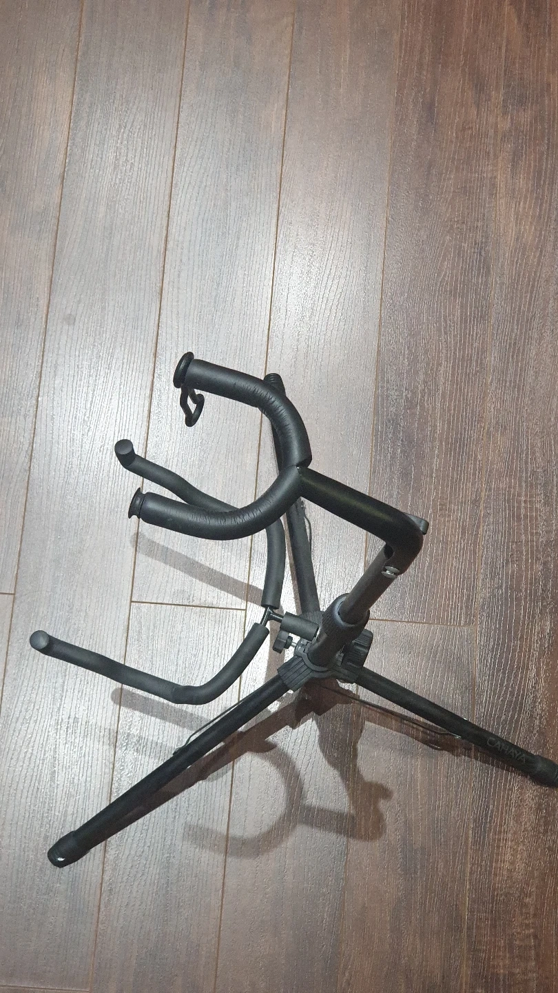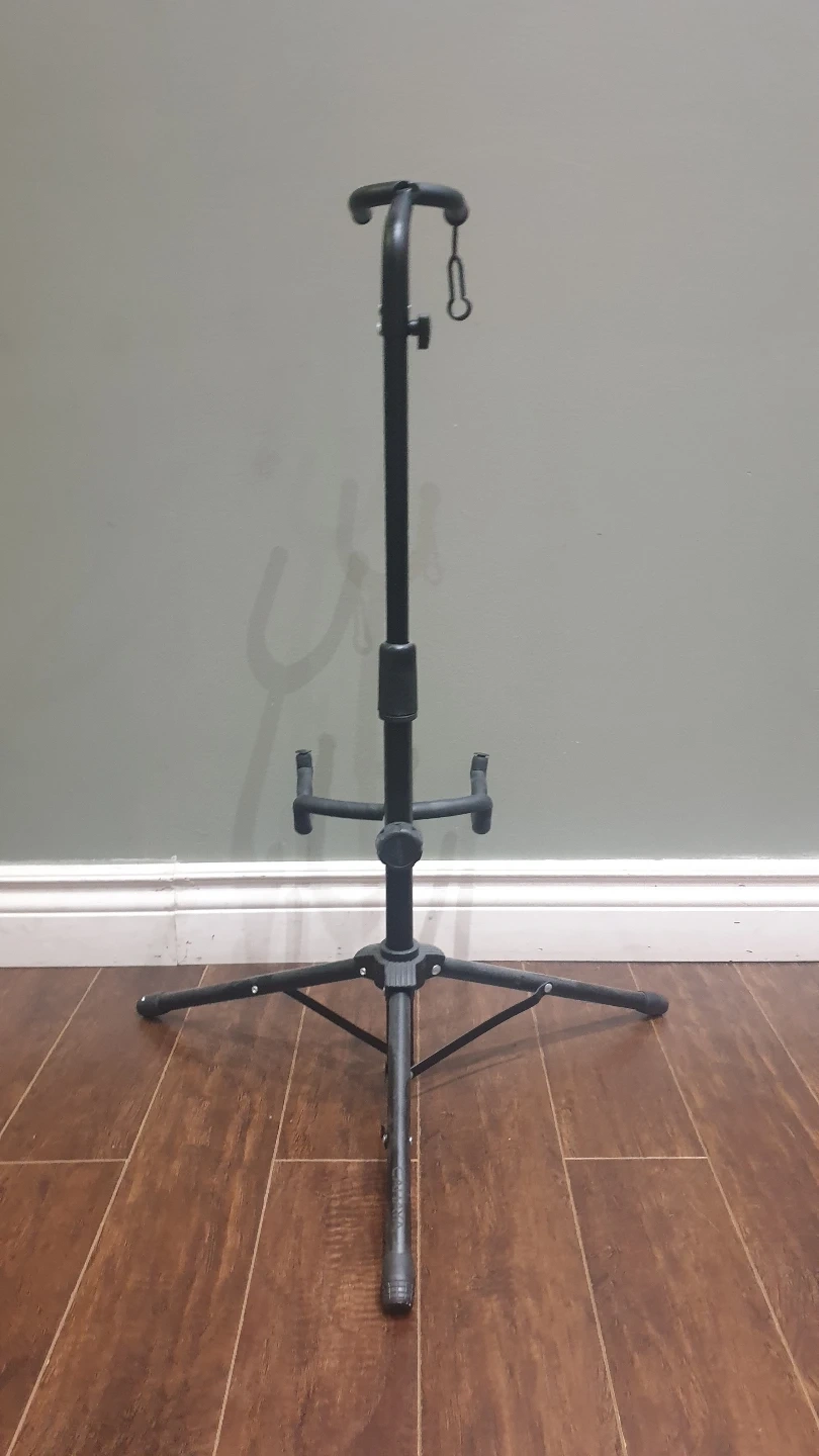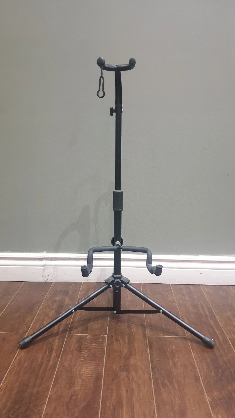 Black guitar stand. Tripod base. Lightweight and foldable. Good for storage and transport. Suitable for electric and acoustic guitars