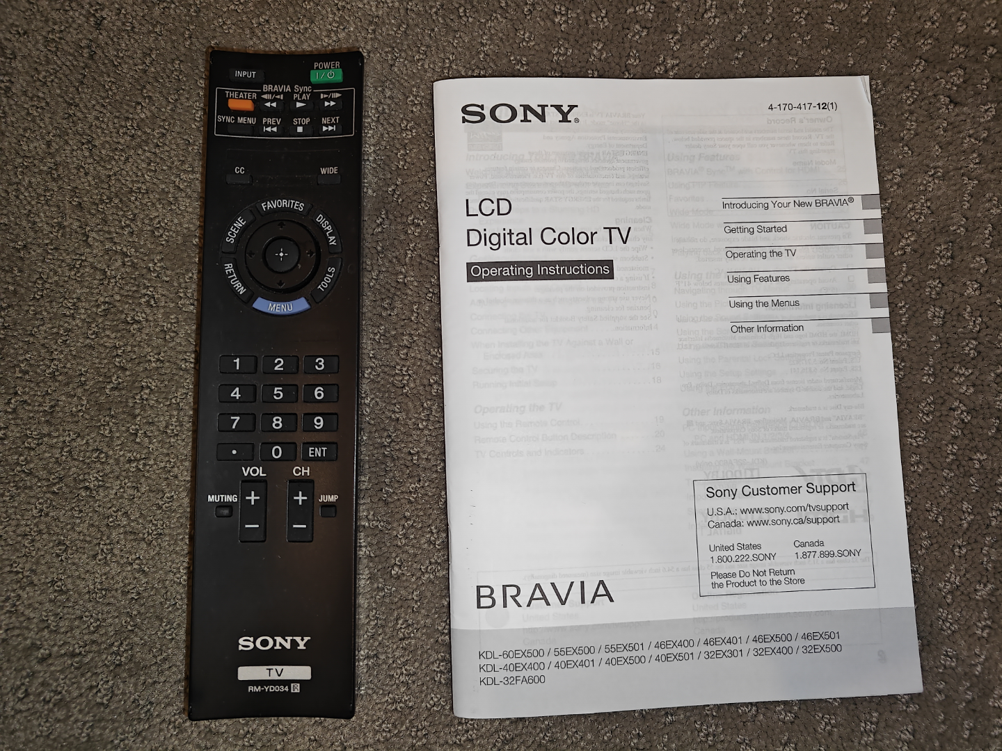 I am selling a Sony BRAVIA 40" LCD Television - KDL-40EX500 in used, tested, and excellent working condition. We just used this TV as a spare and it was not used much. Upgrade your home entertainment setup with this Sony BRAVIA KDL-40EX500 40” LCD TV. Everything works perfectly — screen, sound, ports, and remote. Ideal for a bedroom, guest room, or secondary living space. Includes original remote control and user manual. Gently used, no dead pixels, no issues. Just plug and play. Originally paid $700.
