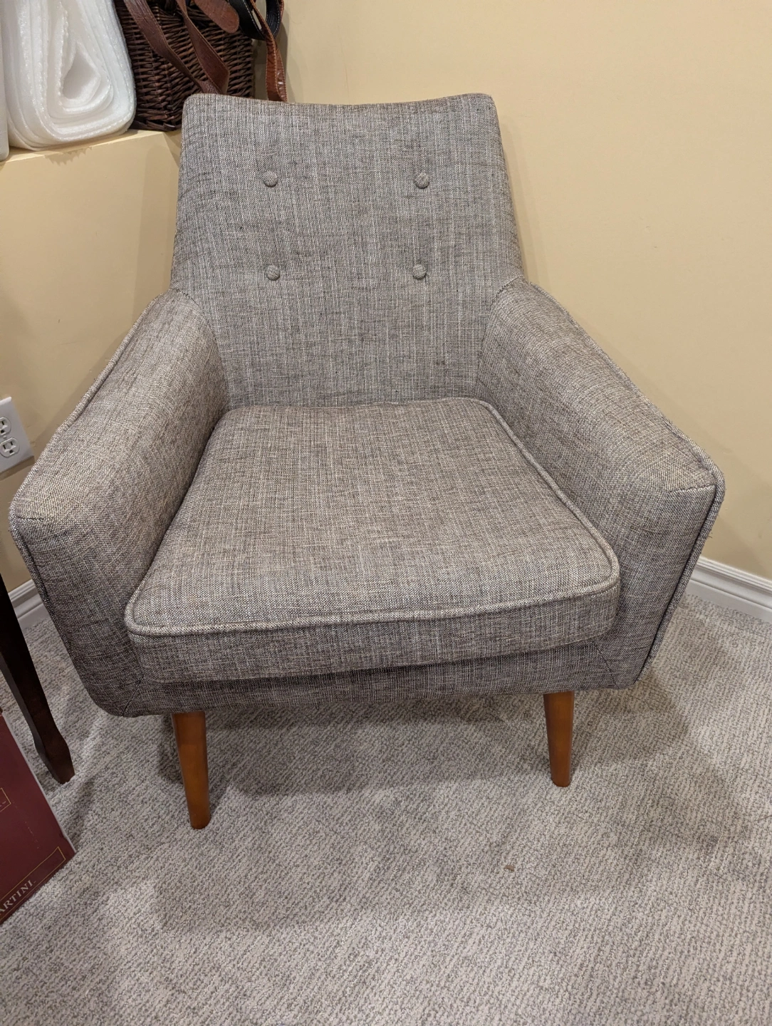 Grey fabric armchair. Wooden legs. Button tufting on the back. Mid-century modern style. Comfortable and stylish addition to any room. Great condition.