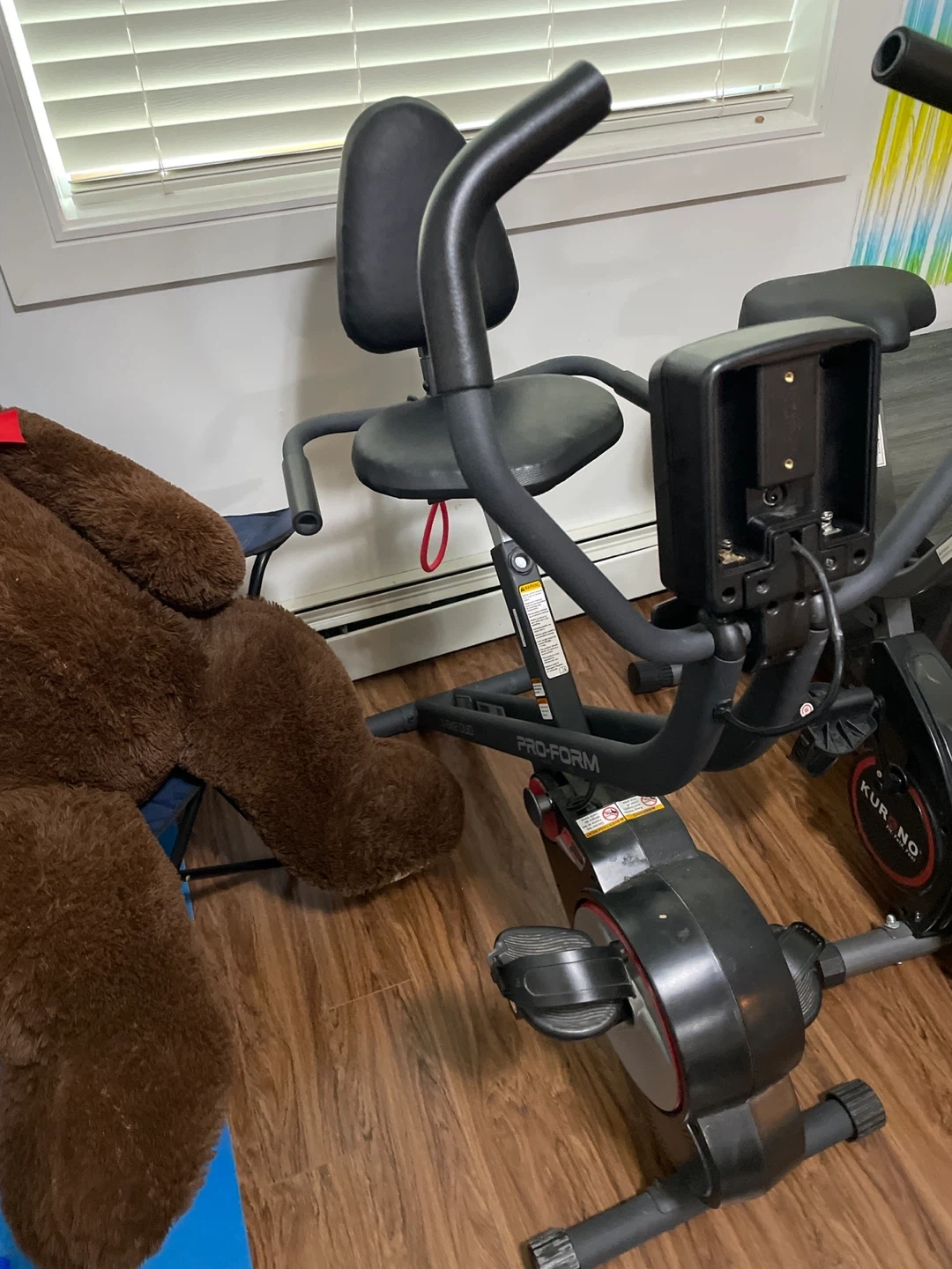 This is a Pro-Form stationary exercise bike. It features a comfortable seat and adjustable resistance. Perfect for home workouts!