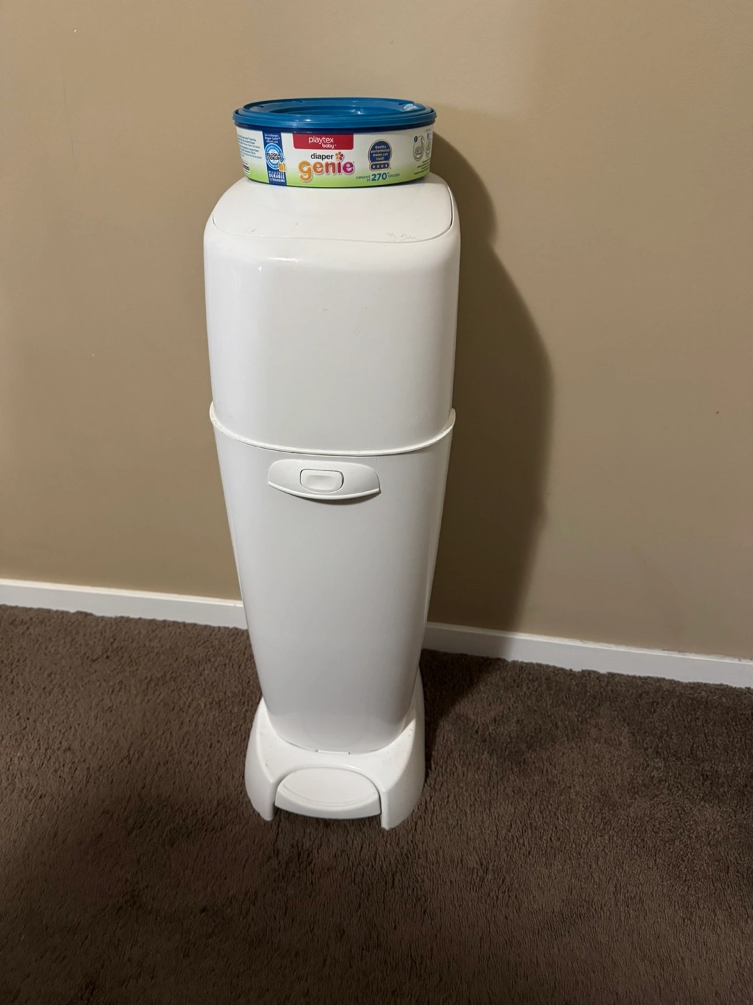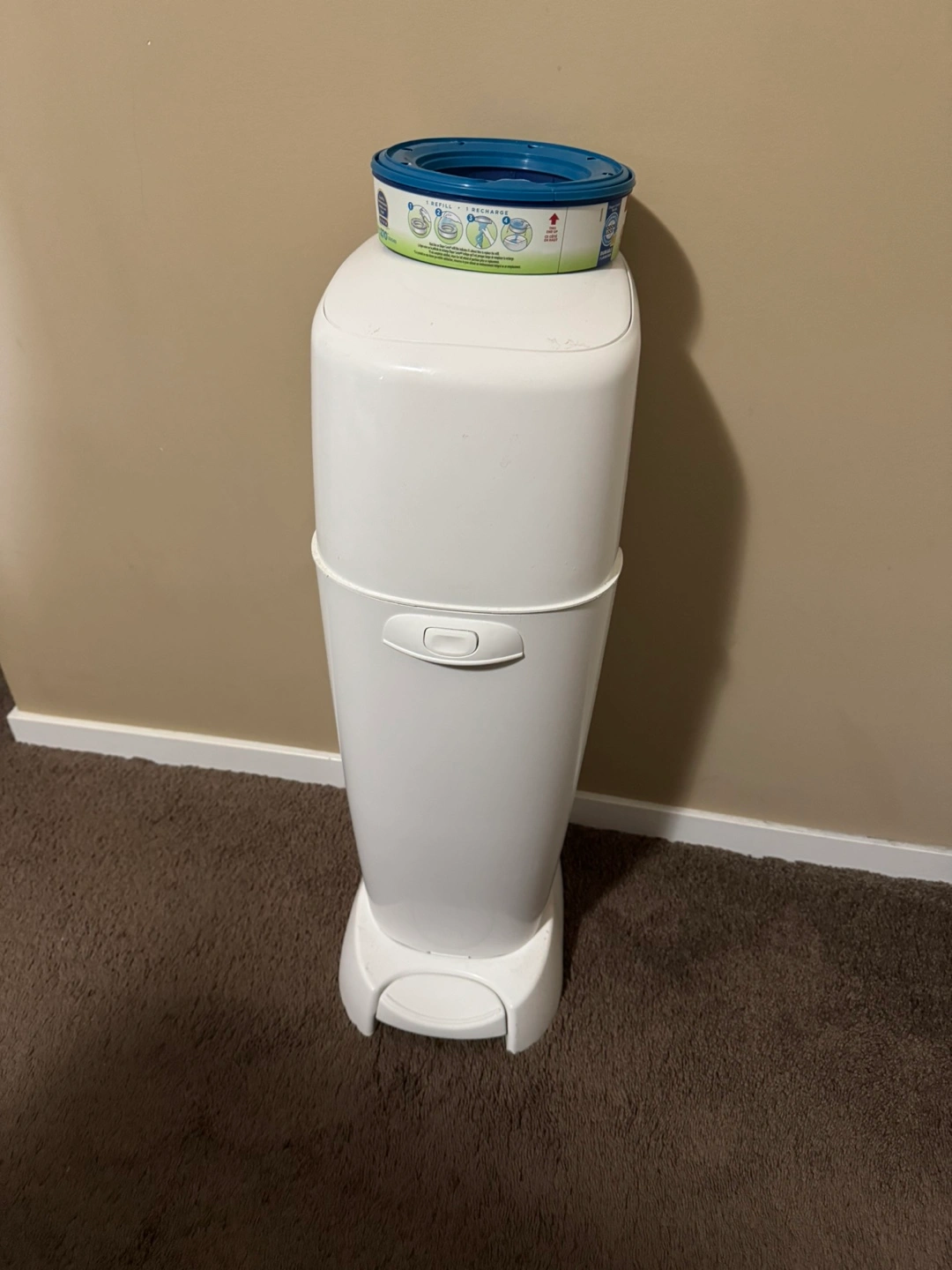 White diaper pail. Includes one refill. Great for keeping your nursery smelling fresh.