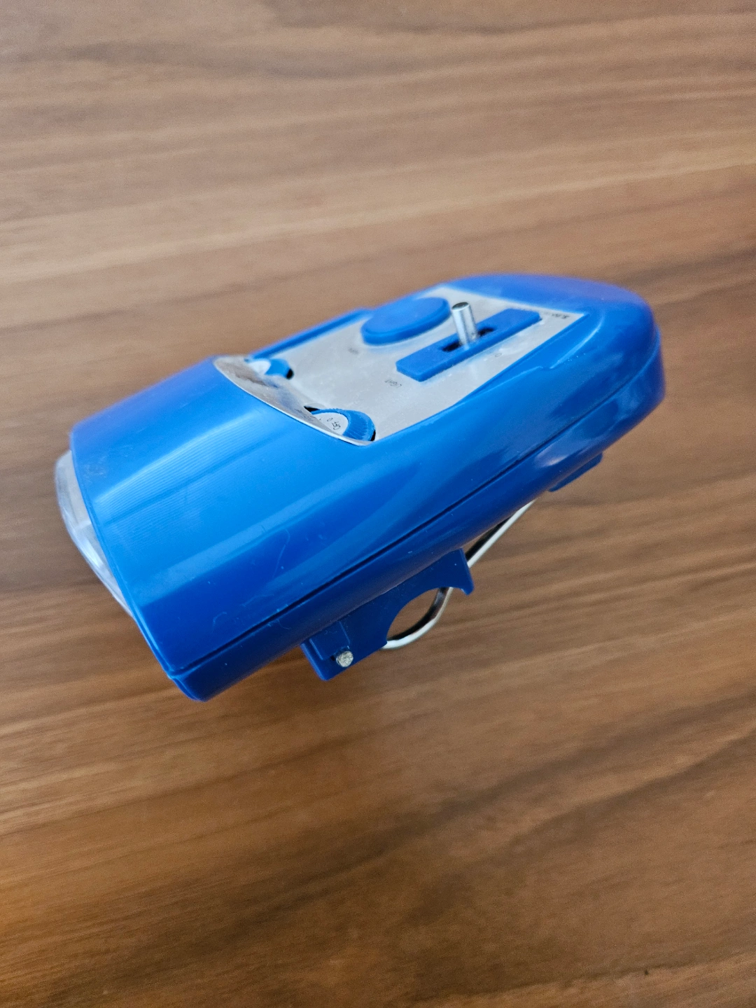 Blue plastic vintage emergency radio. Features volume and tuning knobs, light switch, horn button, and blinking/siren alarm. Includes a stand. Takes 4 AA batteries.