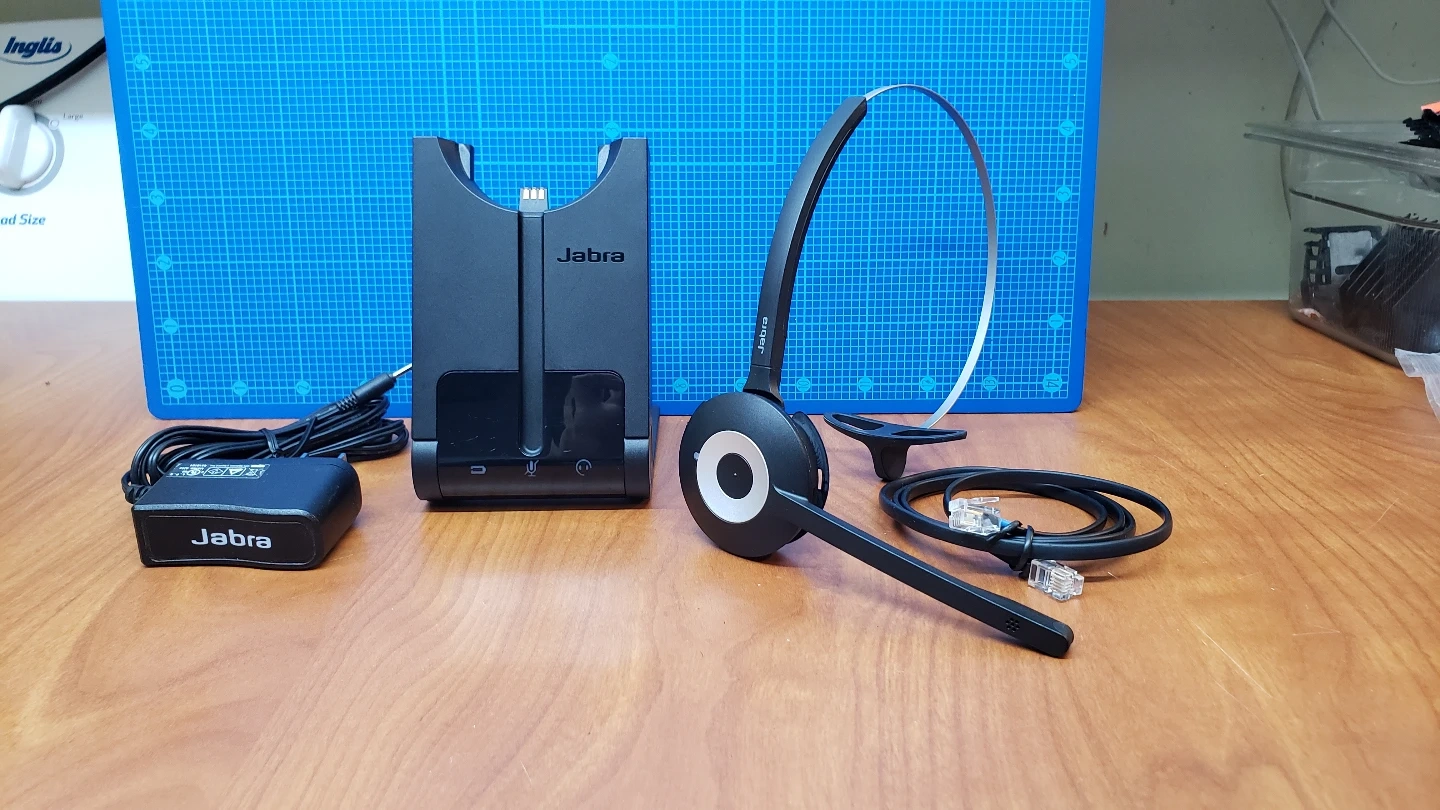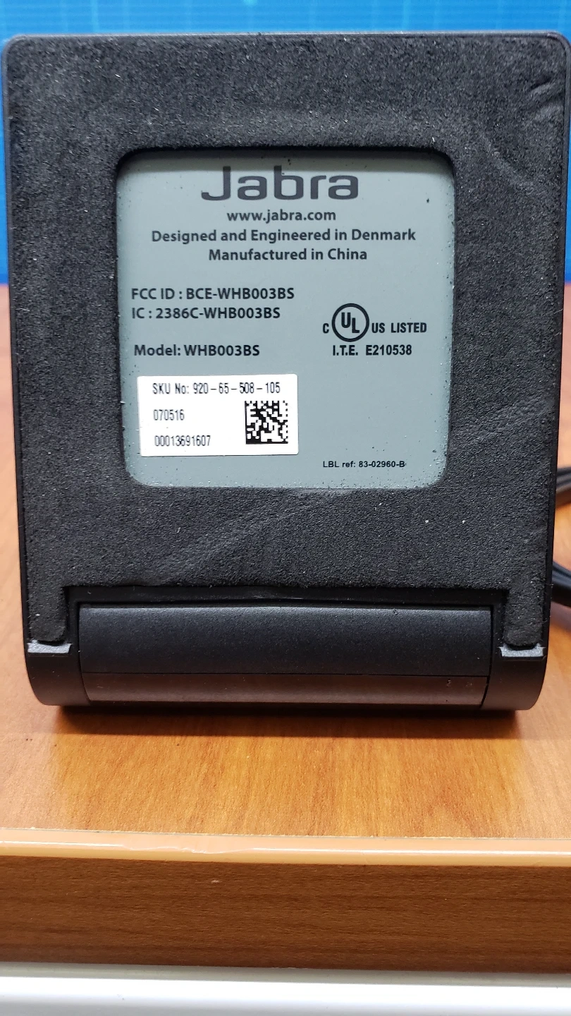Jabra wireless telephone headset with base. Includes charging cradle and power adapter. Model WHB003BS.