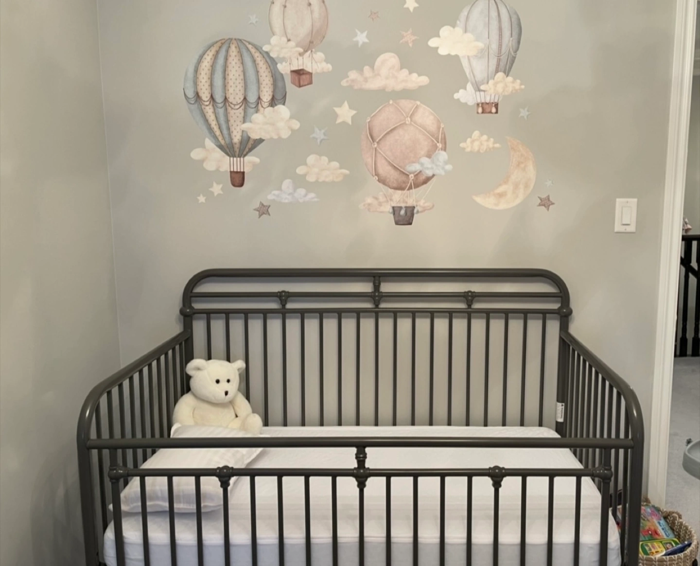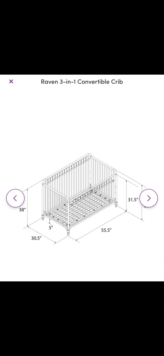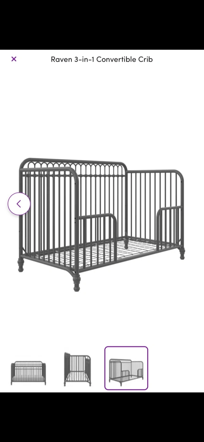 Metal crib, converts to toddler bed with included toddler rail. Barely used. Grey metal finish. Excellent condition. Mattress included