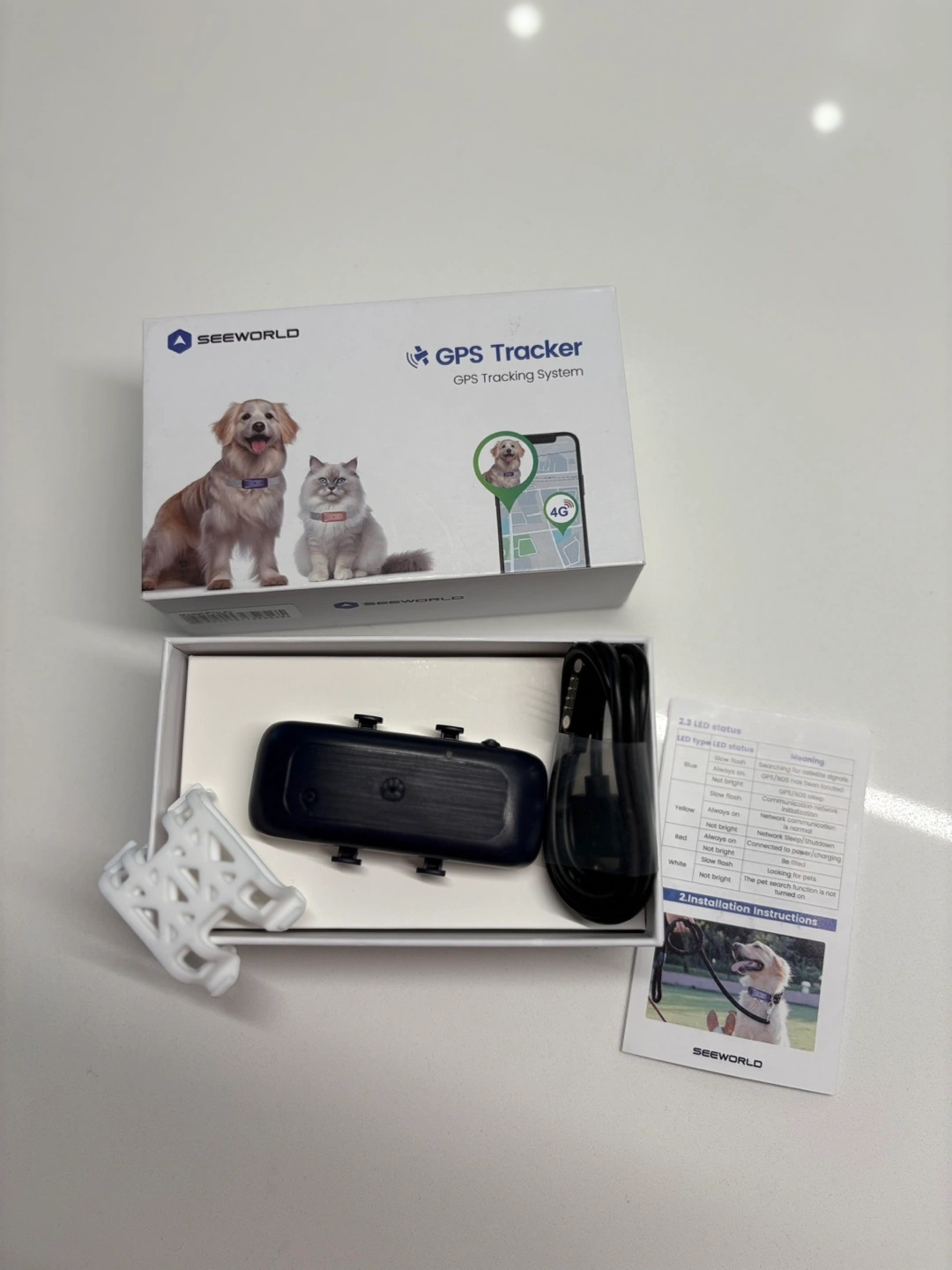 New SeeWorld GPS tracker for pets. Includes device, charging cable, and collar attachment. Easy to use, 4G compatible. Monitor your pet's location.