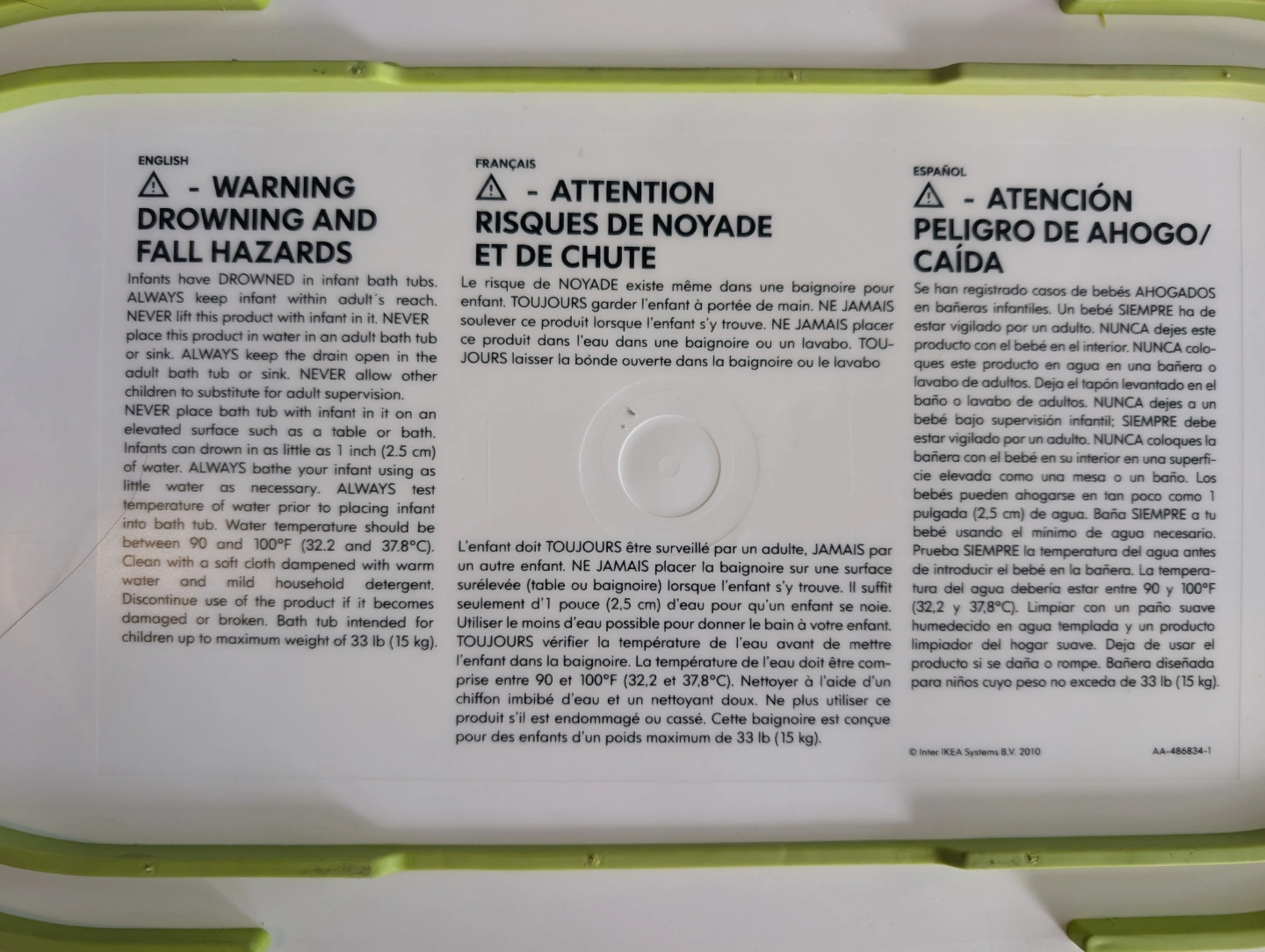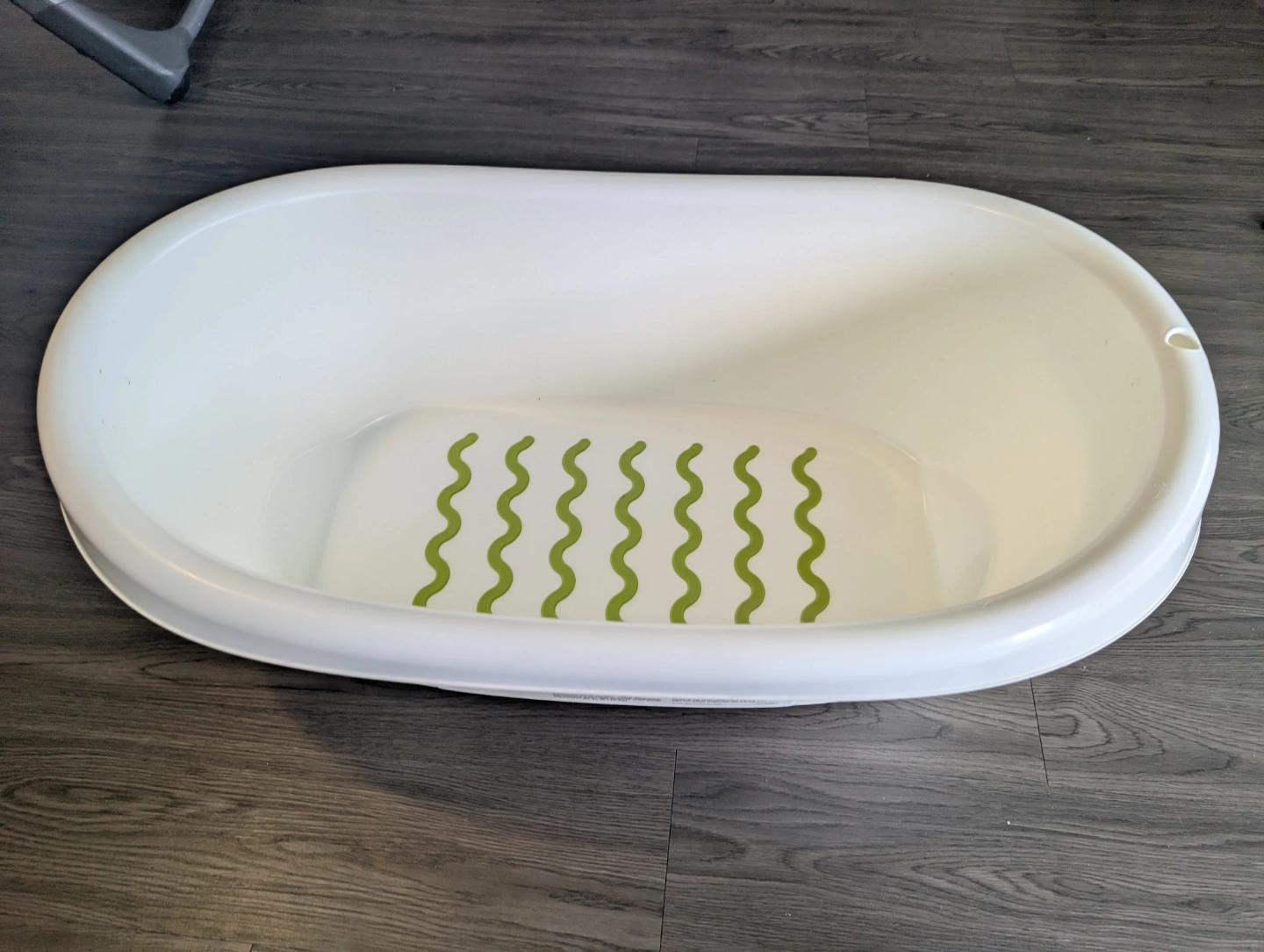 White oval baby bathtub. Includes green non-slip strips. Suitable for infants. Maximum weight capacity 33 lbs (15 kg). Good condition.