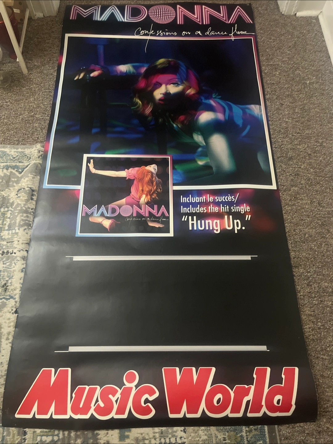 369Large format promotional poster. Features album art and photos of Madonna. Includes the hit single "Hung Up." Music World branding visible. Excellent condition. 3 feet by 6 feet Has grommets for hanging has slots for promo inserts Comes in tube