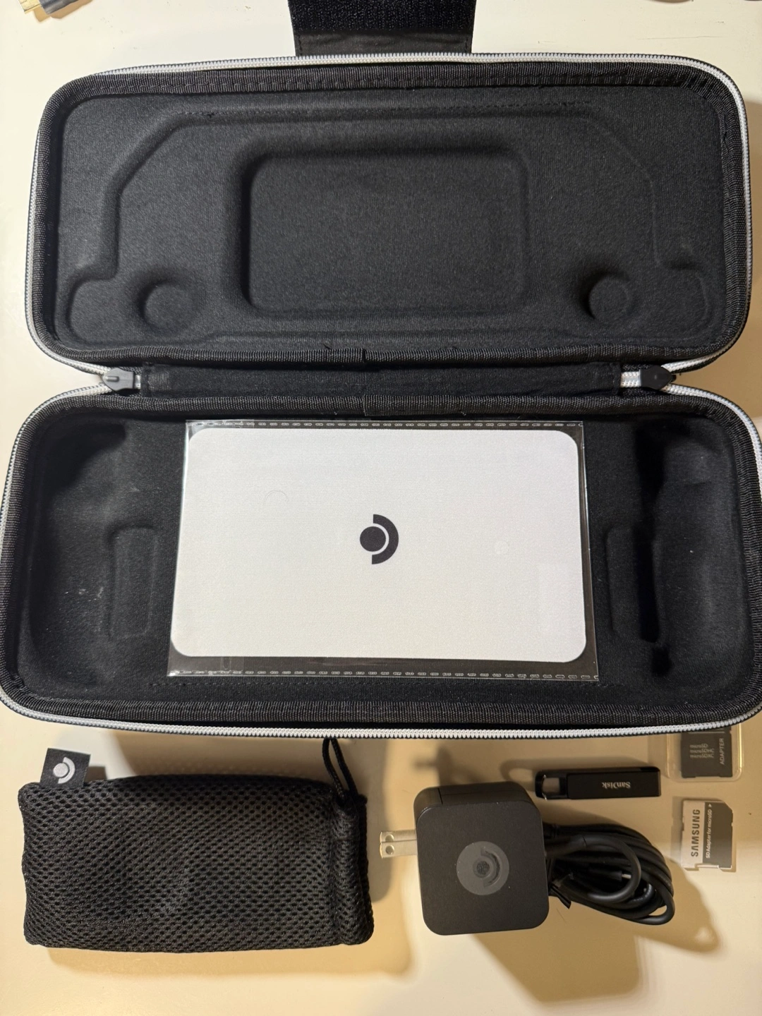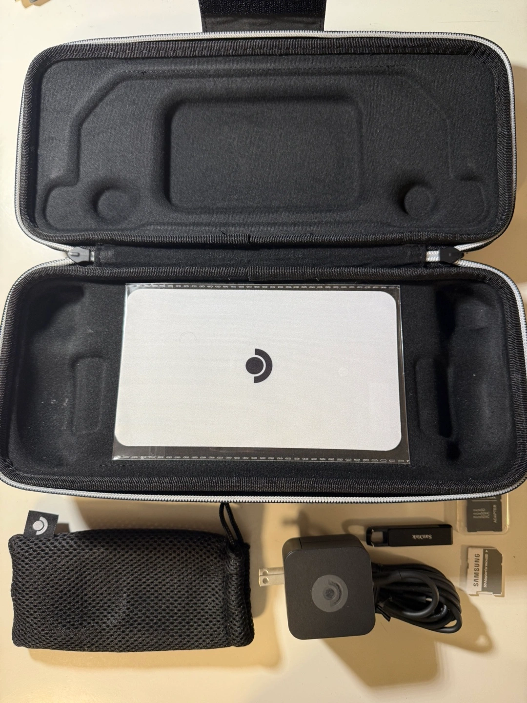 Steam Deck handheld gaming console. Includes carrying case, charger, USB-C cable, mesh carrying pouch, and microSD card. Samsung microSD adapter included.