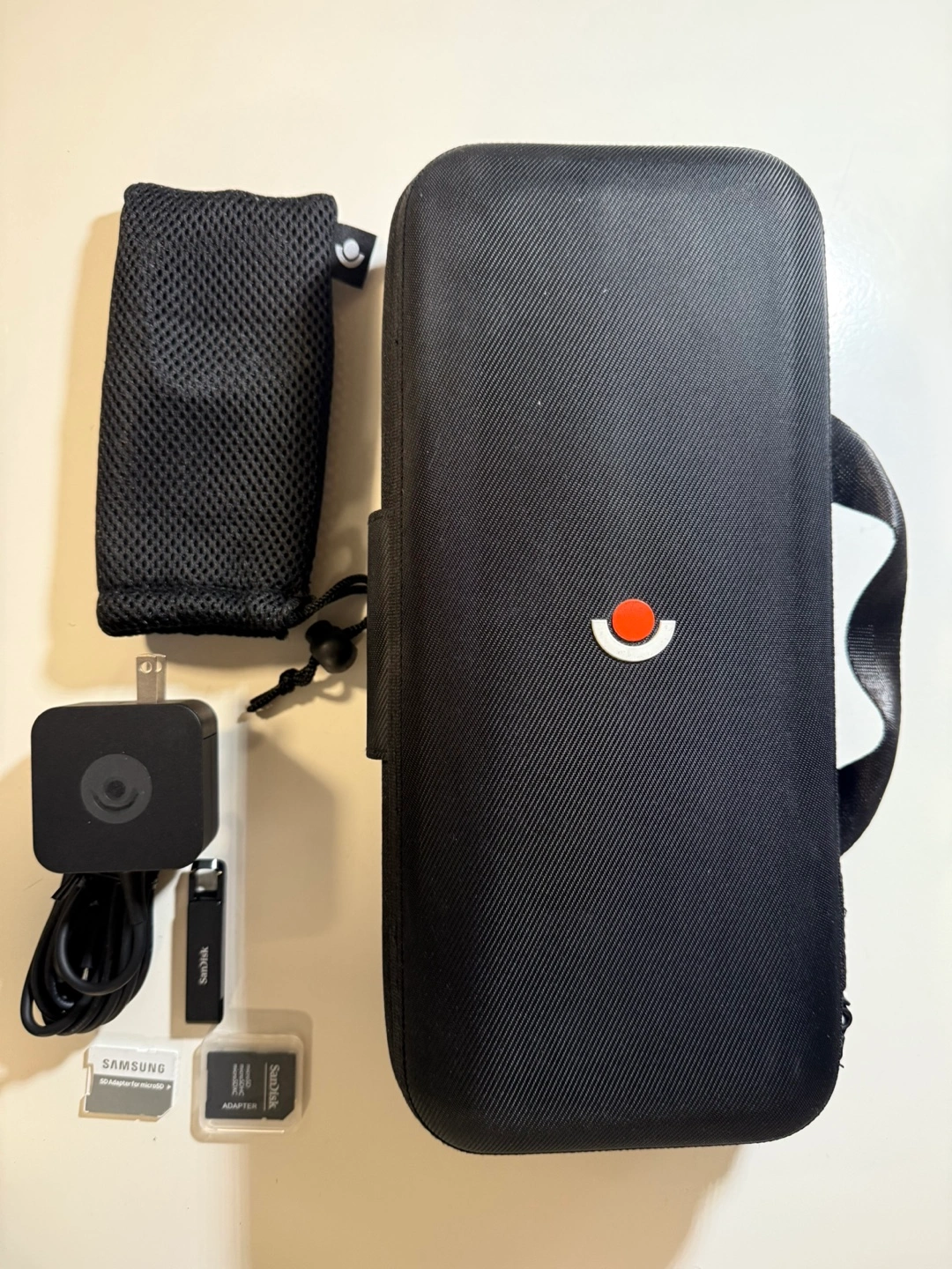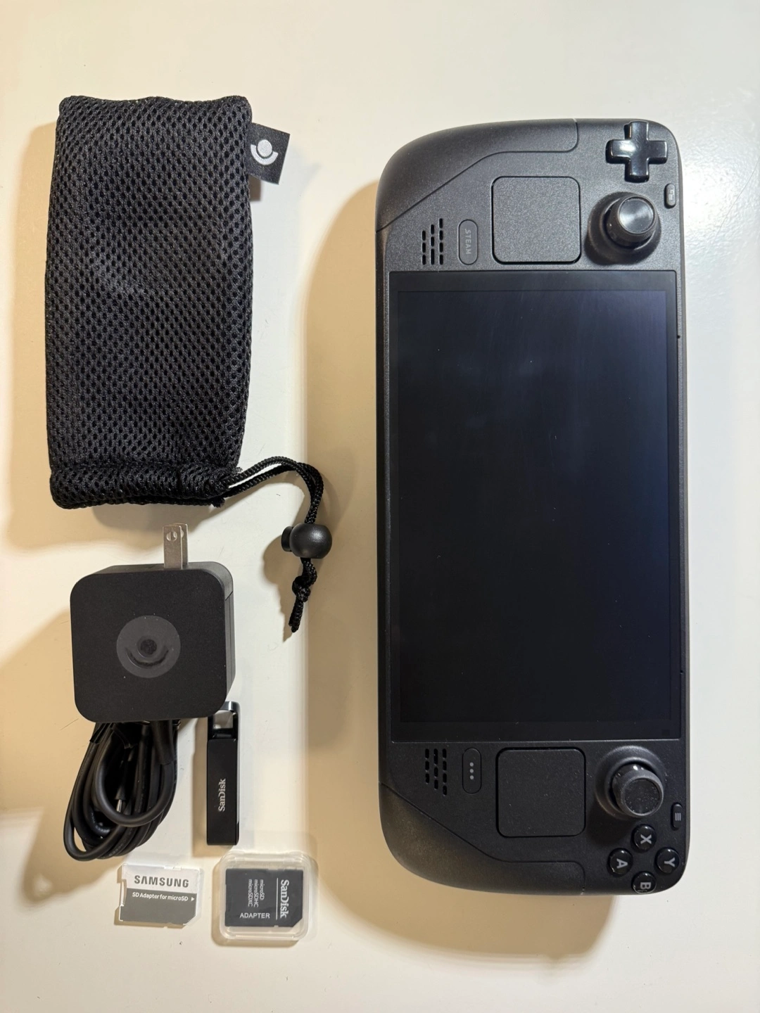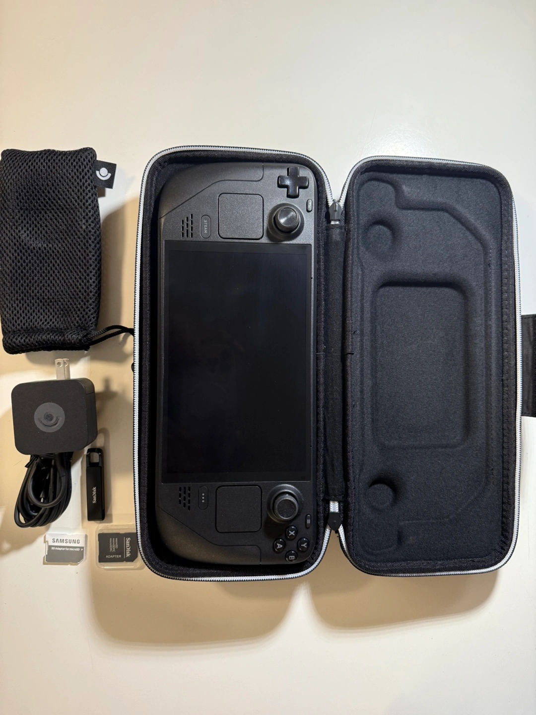 Steam Deck handheld gaming console. Includes carrying case, charger, USB-C cable, mesh carrying pouch, and microSD card. Samsung microSD adapter included.