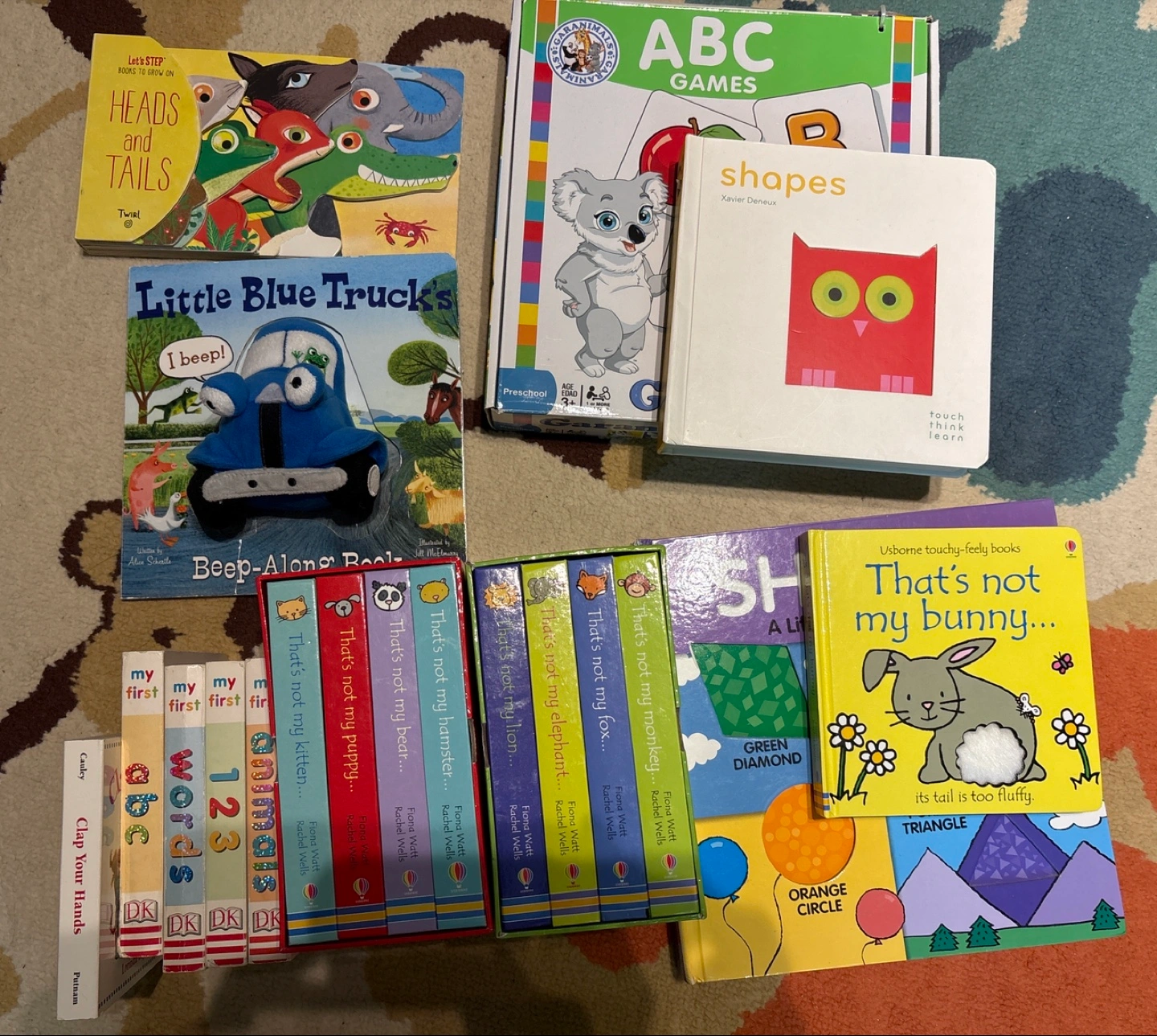 Large collection of children's books. Includes lift-the-flap, touch-and-feel, and interactive elements. Perfect for toddlers and preschoolers. include Heads and Tails, Little Blue Truck, shapes, That's Not My Bunny, and more. Also includes alphabet and number books. Pickup only in Thornhill.