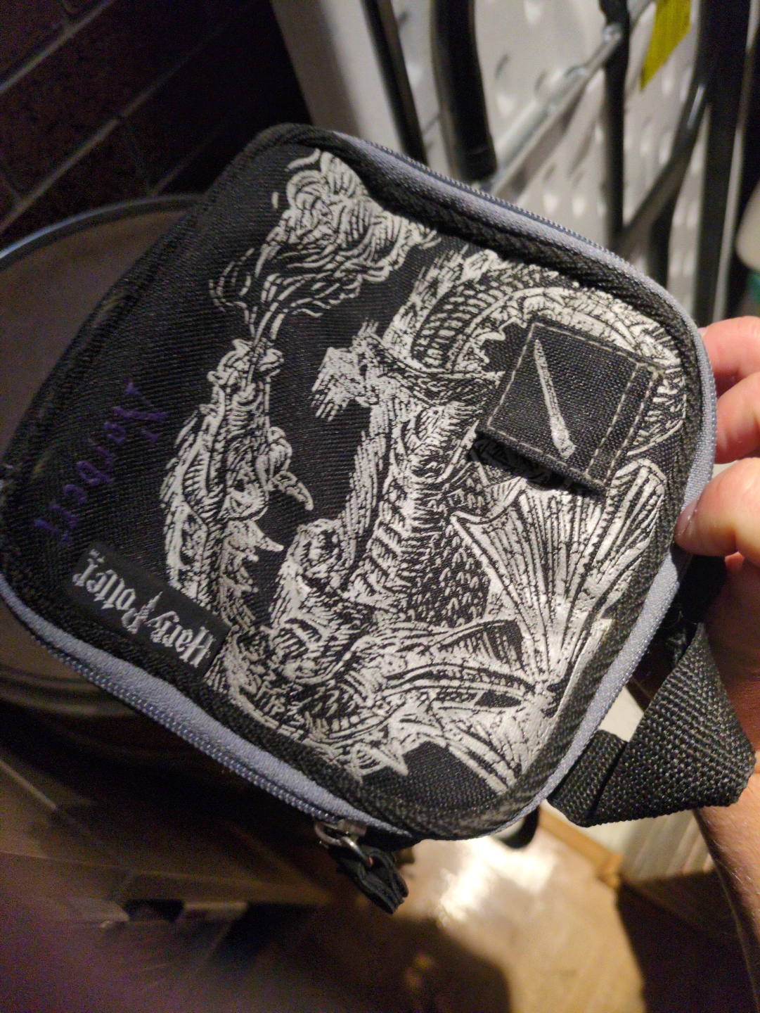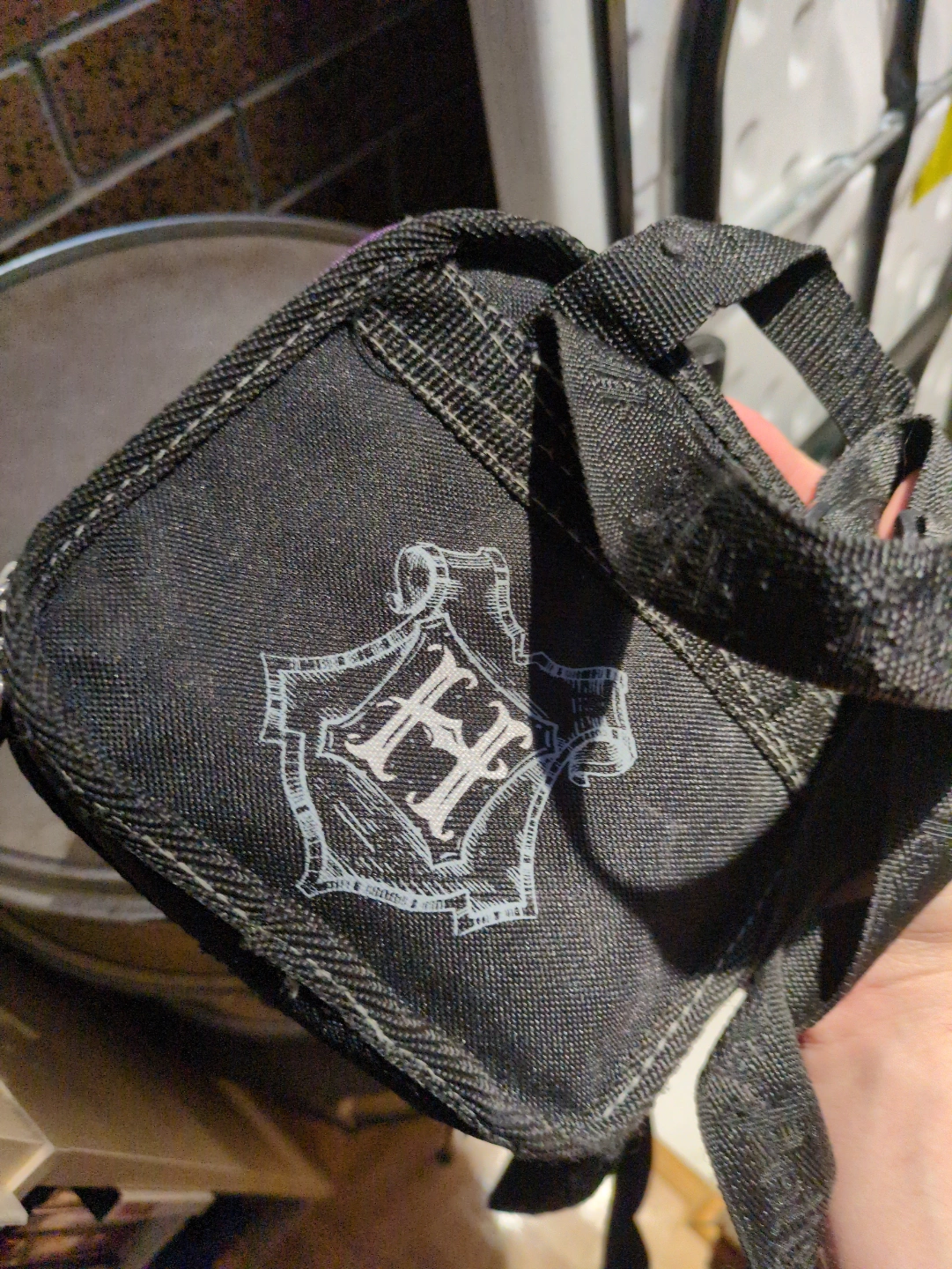 Small black crossbody bag. Features Harry Potter designs. One side shows the Hogwarts crest. The other shows a dragon.