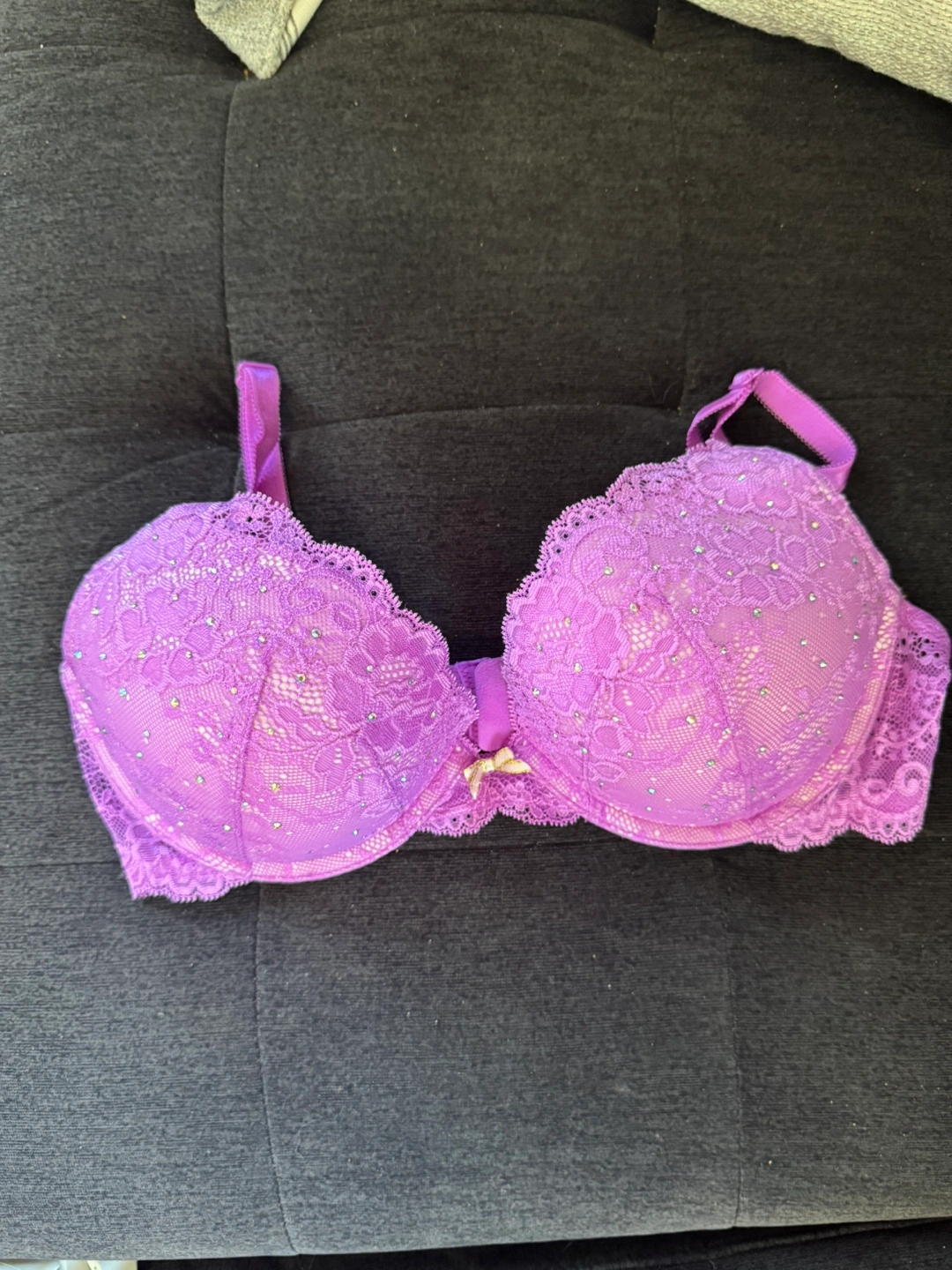 Purple lace bralette with rhinestone detailing. Adjustable straps. Lightly padded cups. Beautiful and comfortable.