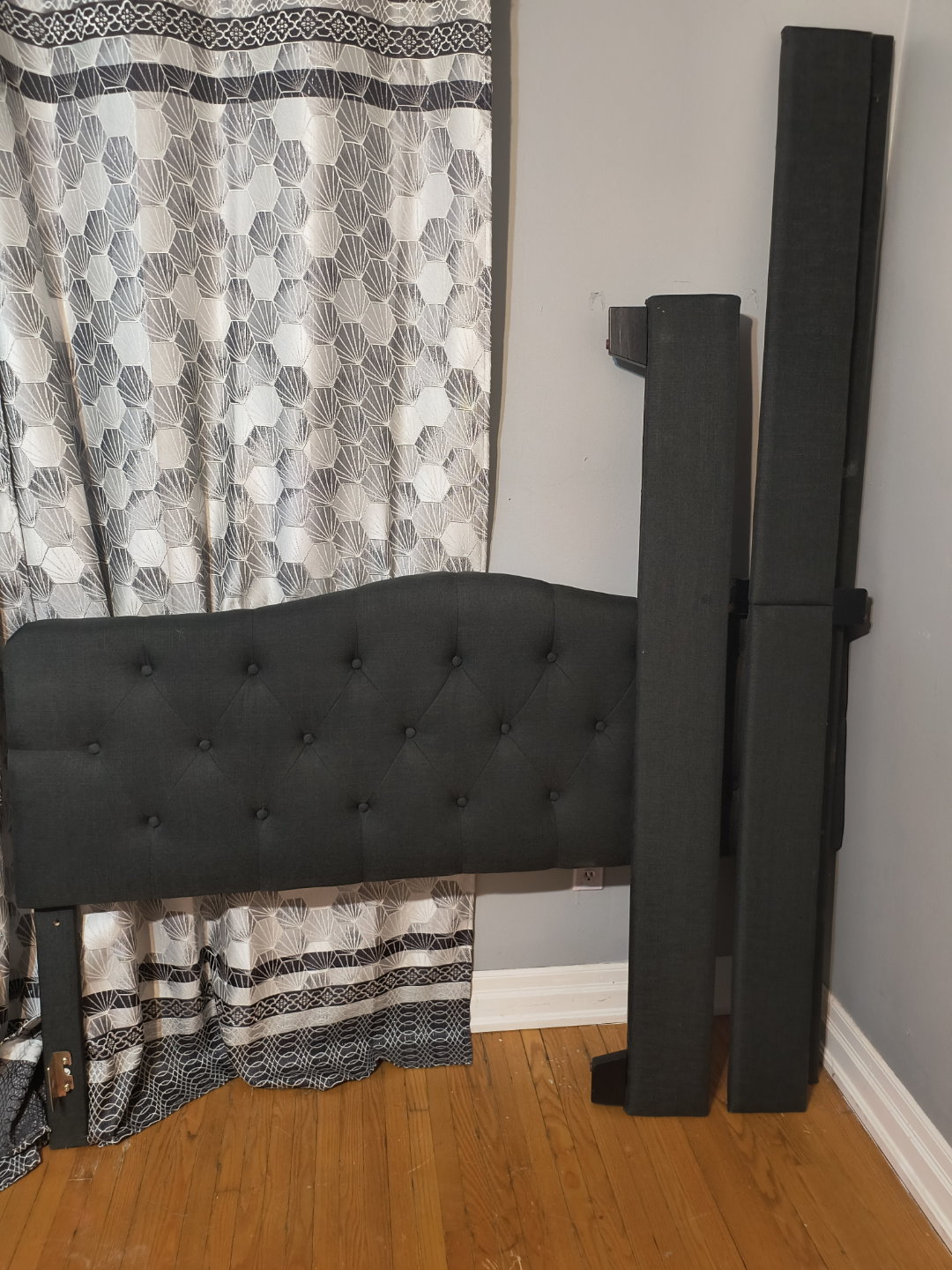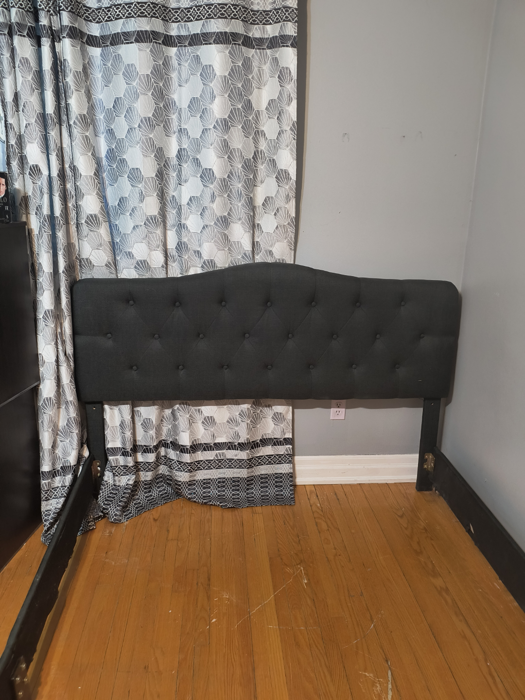 Queen size bedroom set. Includes headboard, mattress. Black fabric headboard. PET and smoke free.