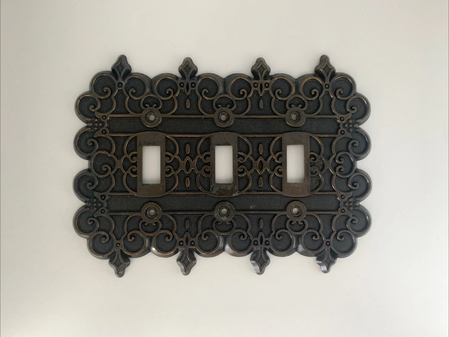 Light switch plate with three switch openings. Dark chocolate/bronze finish. Intricate scroll design. Perfect for adding character to your home. Available for pick-up (corner Laurier Ave W. / Lyon) Cash only - (e-transfers NOT possible). ✨✨✨Also check out my other listings. Lots of interesting items for sale.✨✨✨