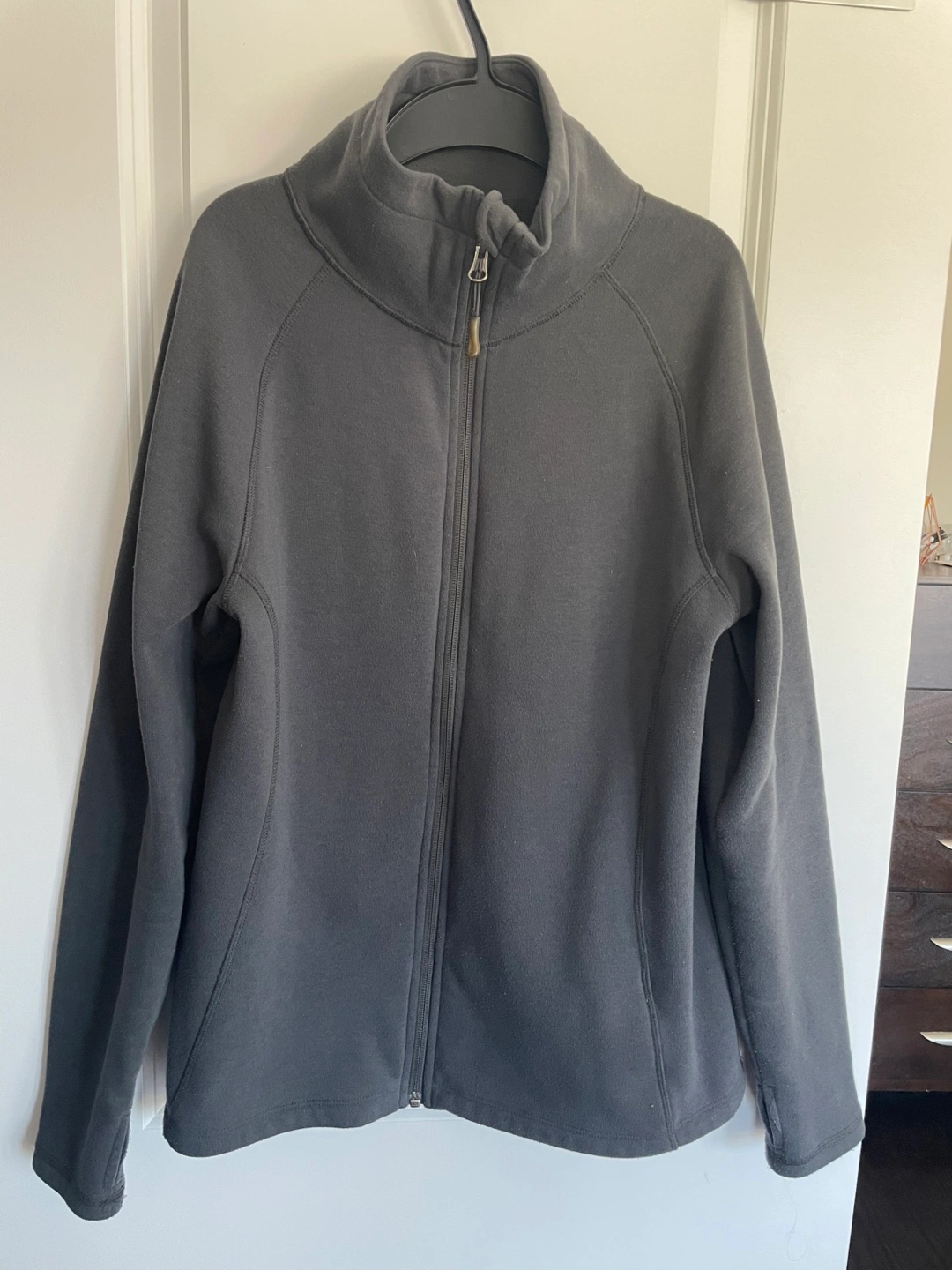 Women's size large black zip-up fleece jacket. Full-zip closure. Long sleeves. Good for layering. Soft material.