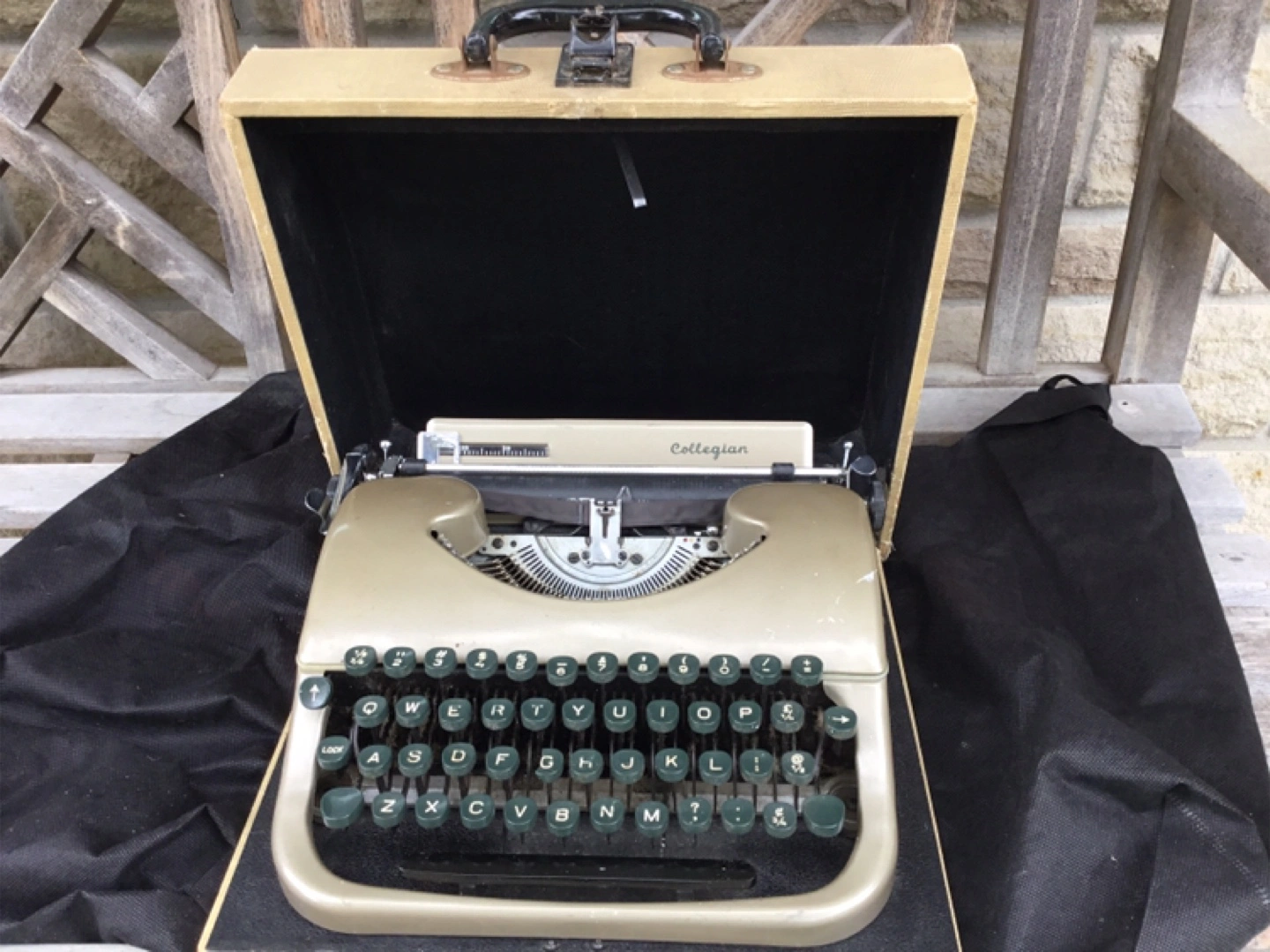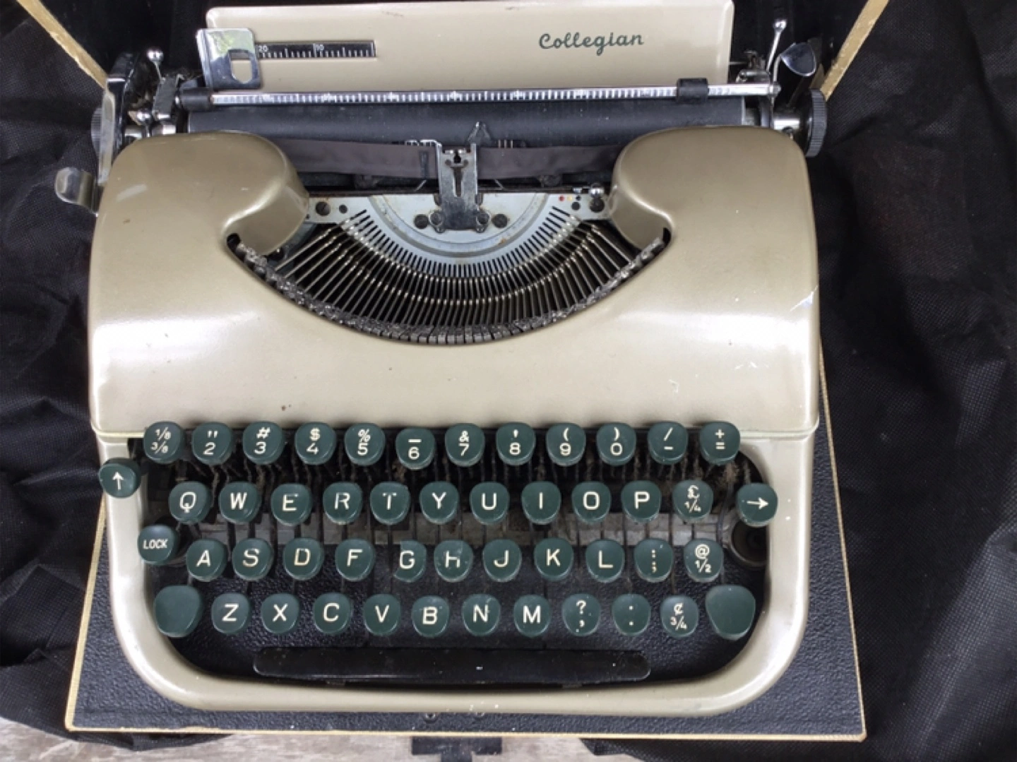 Vintage Collegian brand portable typewriter. Comes in a beige carrying case. Shows some signs of age and wear.