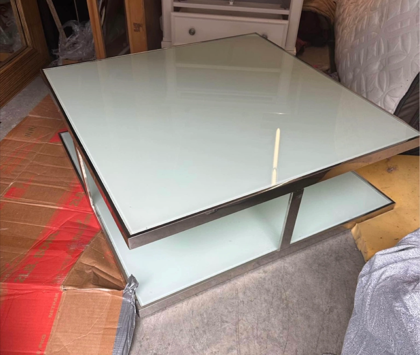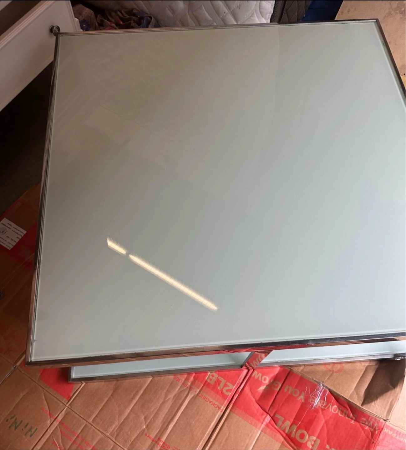 Stylish coffee table. Features frosted glass top and lower shelf. Chrome metal frame. Square shape. Great for modern living room.