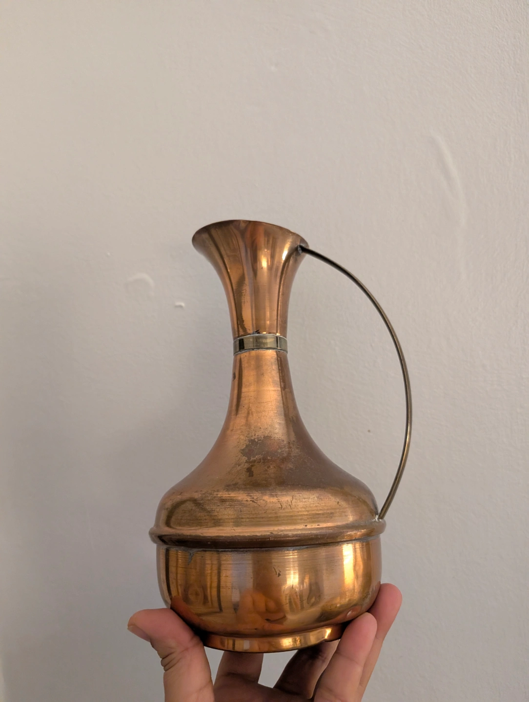 Small vintage copper brass vase with a handle. Features a bulbous body and a slender neck. Antique - shows some signs of age and wear.