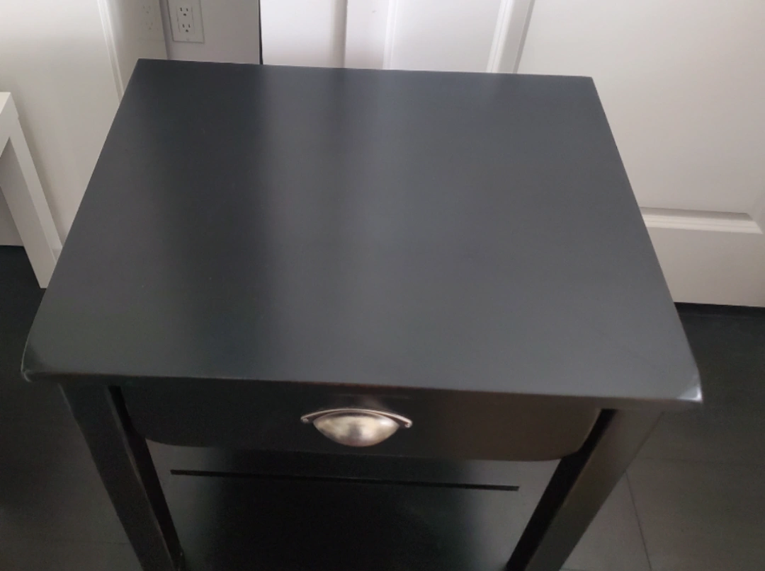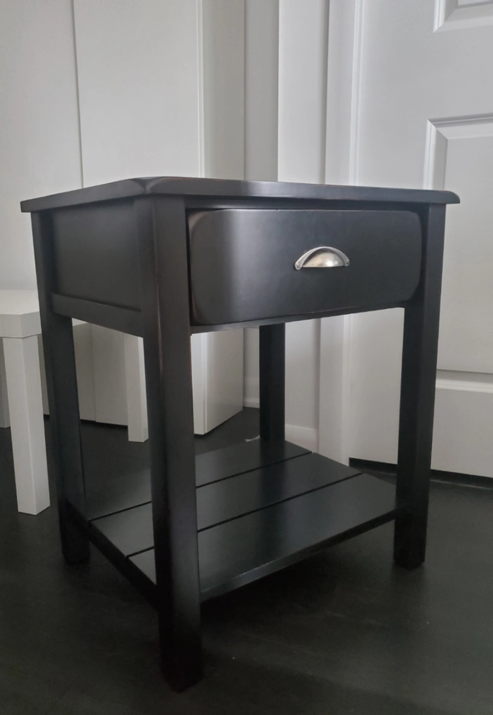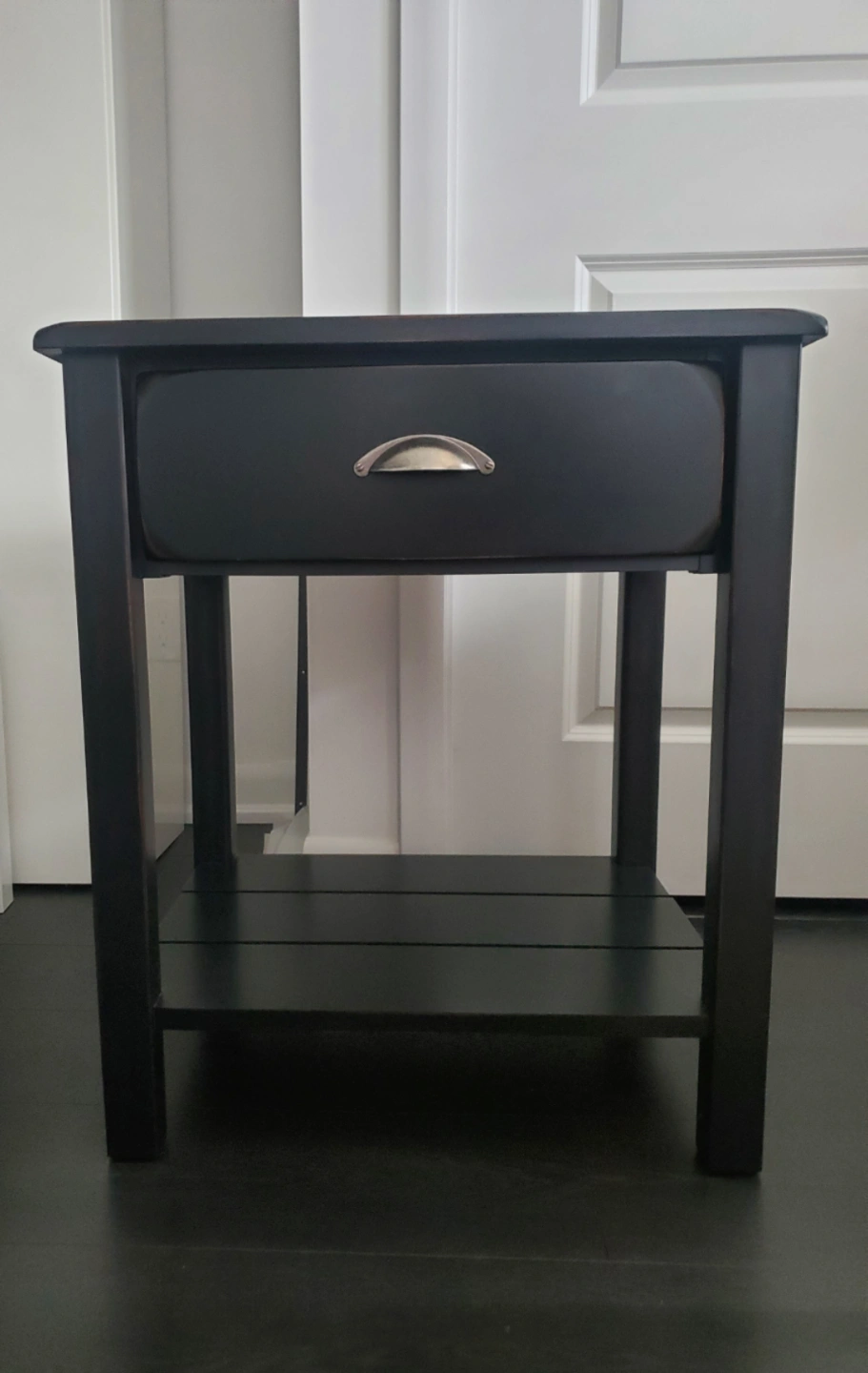 Small black nightstand. One drawer and a lower shelf. Simple design. Solid wood construction.